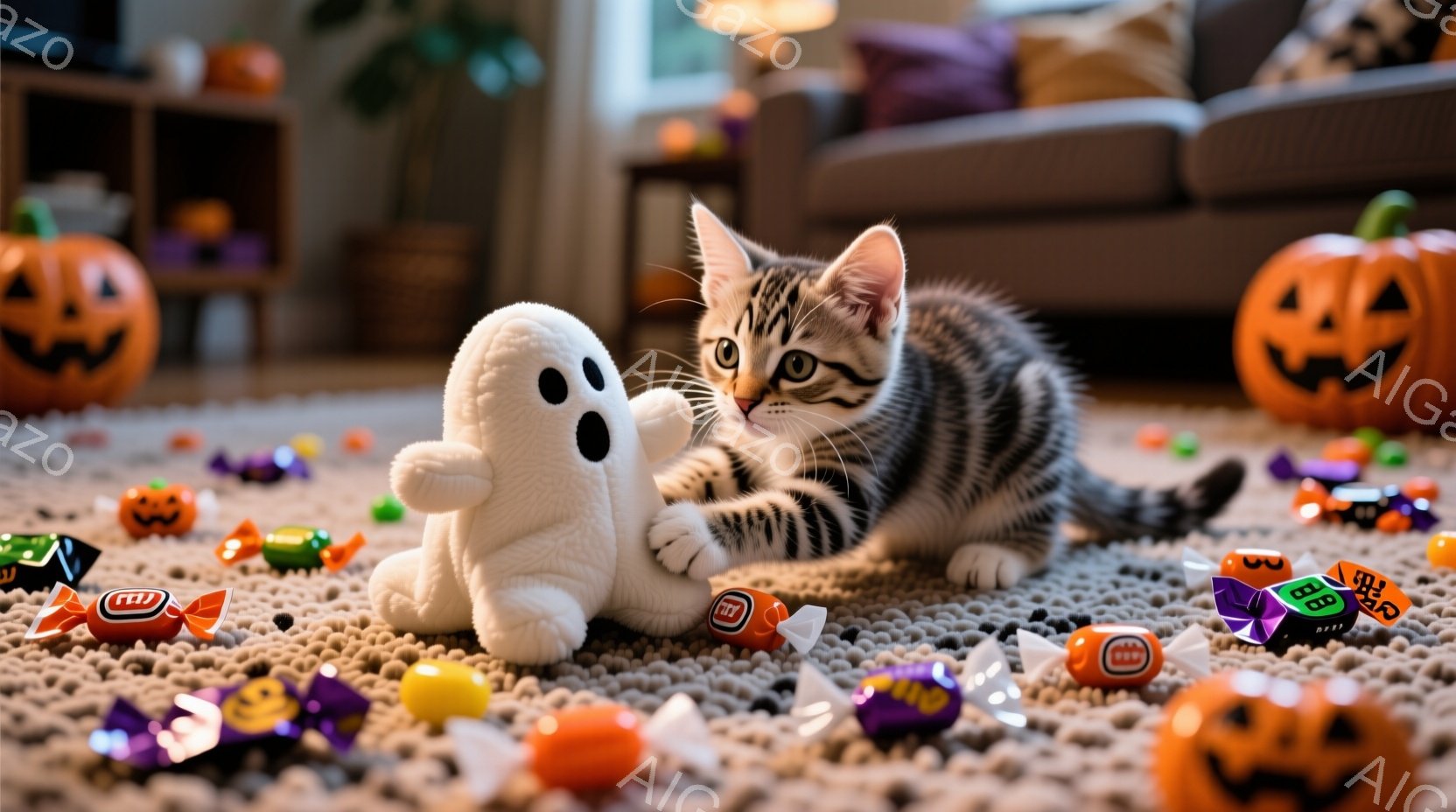縞模様の小さな子猫が、白いふわふわの幽霊のぬいぐるみと遊んでいます。周囲にはハロウィーンのキャンディが散らばり、背景にはオレンジ色のジャック・オー・ランタンが並び、暖かく遊び心のある雰囲気を醸し出しています。子猫は遊び心いっぱいの表情で、前足で幽霊のぬいぐるみを軽く叩いています。