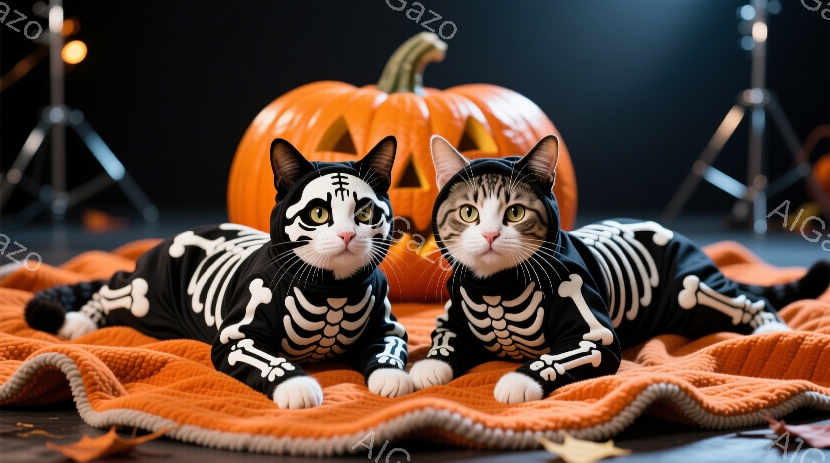 2匹の猫がハロウィーンの衣装を着てオレンジ色の毛布の上に横たわっています。猫たちは骸骨のプリントが入った黒と白の衣装を着ており、少し驚いたような表情をしています。背景には、さまざまな大きさのジャック・オ・ランタンと、暗い床が見え、全体的にハロウィーンの楽しい雰囲気を醸し出しています。