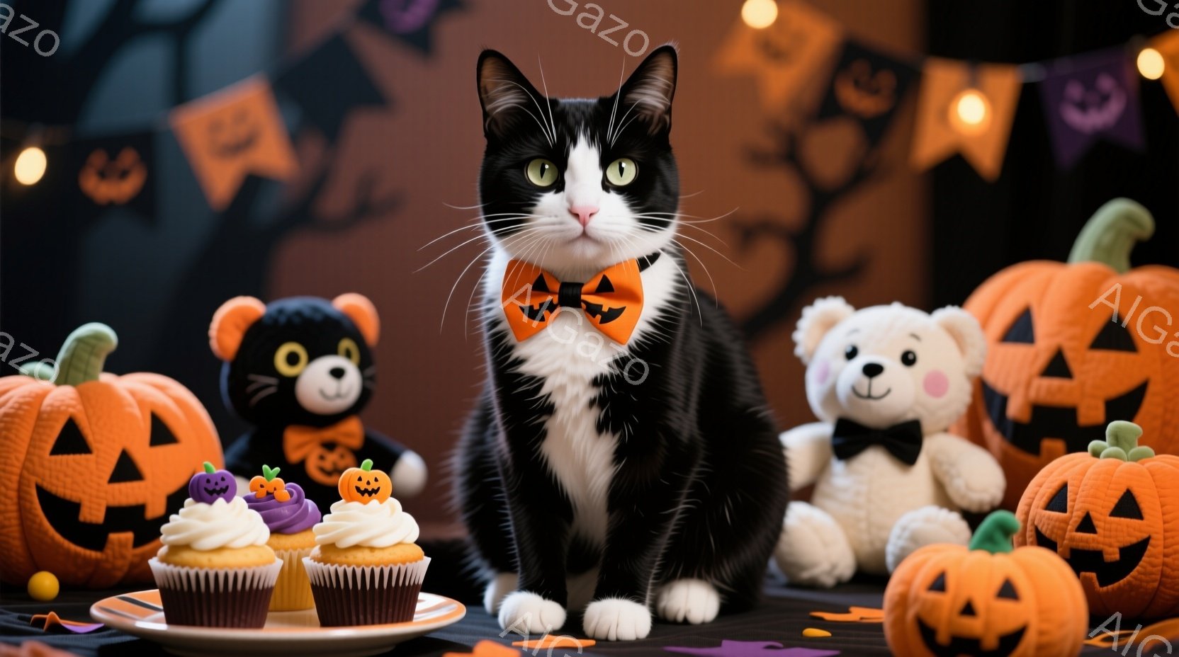 この無料AI生成画像「縞模様の猫がハロウィーンの幽霊の衣装を着て、落ち葉が舞う庭の小道の中央を歩いている。背景には、光るジャック・オー・ランタンや、ぼんやりと見える家々と木々があり、暖かい光が秋の夜を照らしている。全体的に、秋らしさとハロウィーンの楽しさが感じられる、暖かく幻想的な雰囲気である。」は、2025年10月24日に作成されました。 サイズは 1664×928px の高解像度で、商用利用も可能なフリー素材として提供しています。