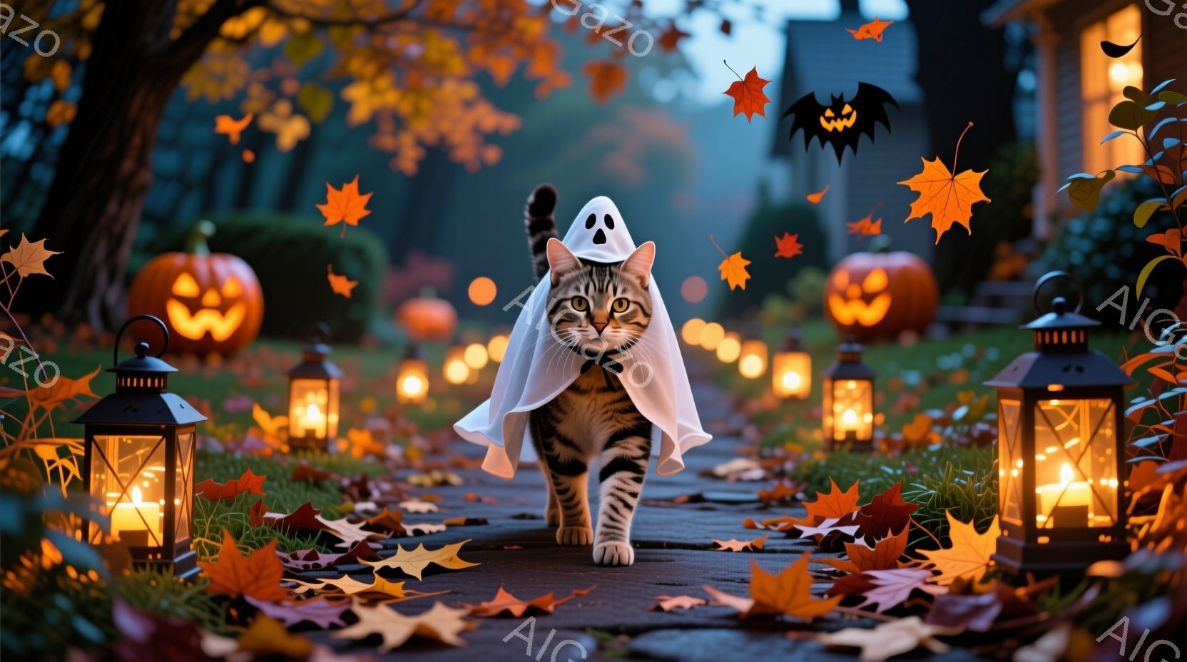 白いハロウィーンの衣装を着た縞模様の猫が、落ち葉が舞う道を歩いている。背景には、光るジャック・オ・ランタンと、オレンジ色の光を放つランタンが並び、秋の夕暮れのような暖かい雰囲気を醸し出している。全体として、可愛らしく、お祭り気分満載のシーンである。