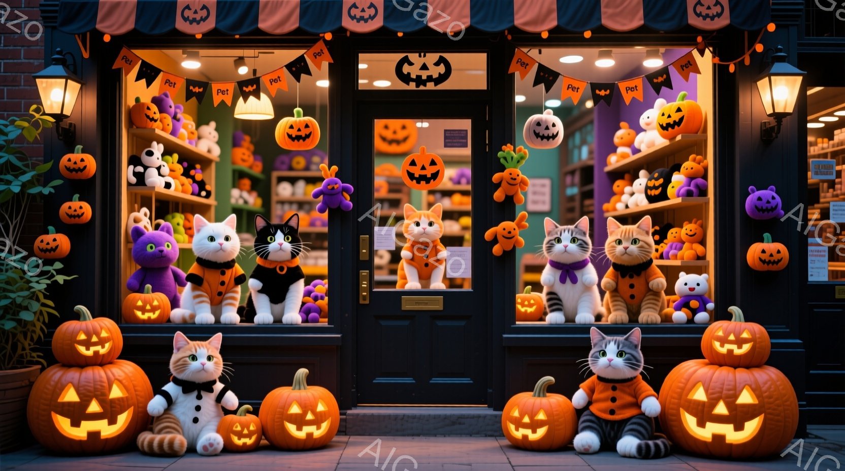 ハロウィーンの装飾で飾られた店の前に、様々なサイズのカボチャと猫のぬいぐるみたちが並んでいる。猫のぬいぐるみはそれぞれハロウィーンをテーマにした衣装を着ており、可愛らしい表情をしている。背景にはハロウィーンの飾り付けがされた店内の様子が見え、全体的に明るくお祝いムードに満ちた雰囲気である。