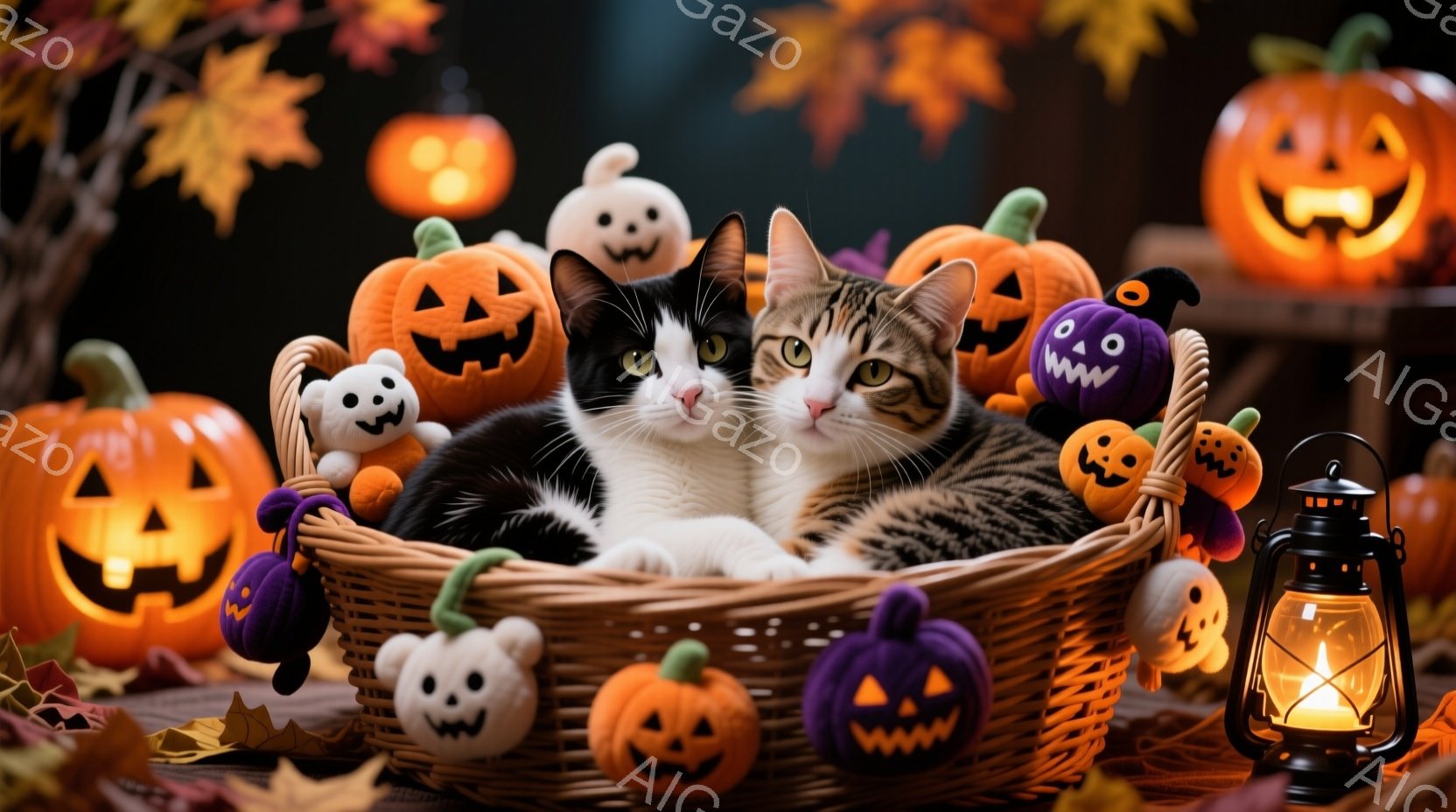 縞模様の猫が、ハロウィーンのパンプキンや幽霊のぬいぐるみがたくさん入ったバスケットの中に座っています。猫は少しいたずらっぽい表情でカメラを見つめ、頭には小さな魔女の帽子をかぶっています。背景には落ち葉が散りばめられ、ハロウィーンランタンが灯っており、全体的に温かく、お祝いムードに満ちた雰囲気です。