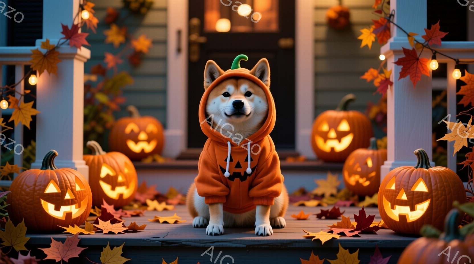 柴犬がハロウィーンの衣装を着て、家の玄関ポーチの階段に座っています。オレンジ色のパーカーを着て、頭には同じ色の帽子がついており、可愛らしい表情をしています。背景には、光を灯したジャック・オ・ランタンや紅葉した葉が散らばり、秋らしい温かく楽しい雰囲気を醸し出しています。