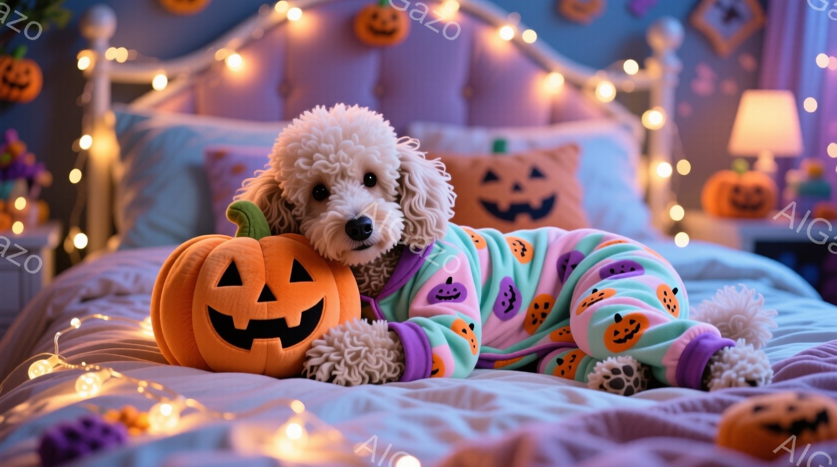白い巻き毛の犬が、ハロウィーンの衣装であるカボチャの形のパジャマを着てベッドに横たわっています。パジャマは水色とピンクで、コウモリとカボチャの柄が描かれており、犬はリラックスした表情で、可愛らしい姿を見せています。背景には、ハロウィーンの飾り付けが施された部屋が広がり、暖かく楽しい雰囲気が漂っています。