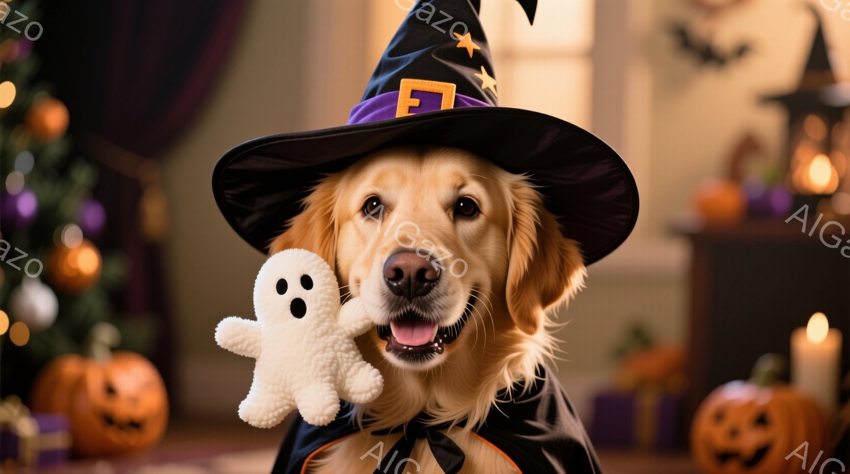 愛らしいフレンチブルドッグが、赤いマントと蝶ネクタイを身につけて座っています。ハロウィーンをテーマにした背景には、カボチャのランタン、お菓子、そして不気味なシルエットが描かれており、お祝いムードが高まります。犬は少しいたずらっぽい表情でカメラを見つめ、遊び心あふれるハロウィーンの雰囲気を醸し出しています。