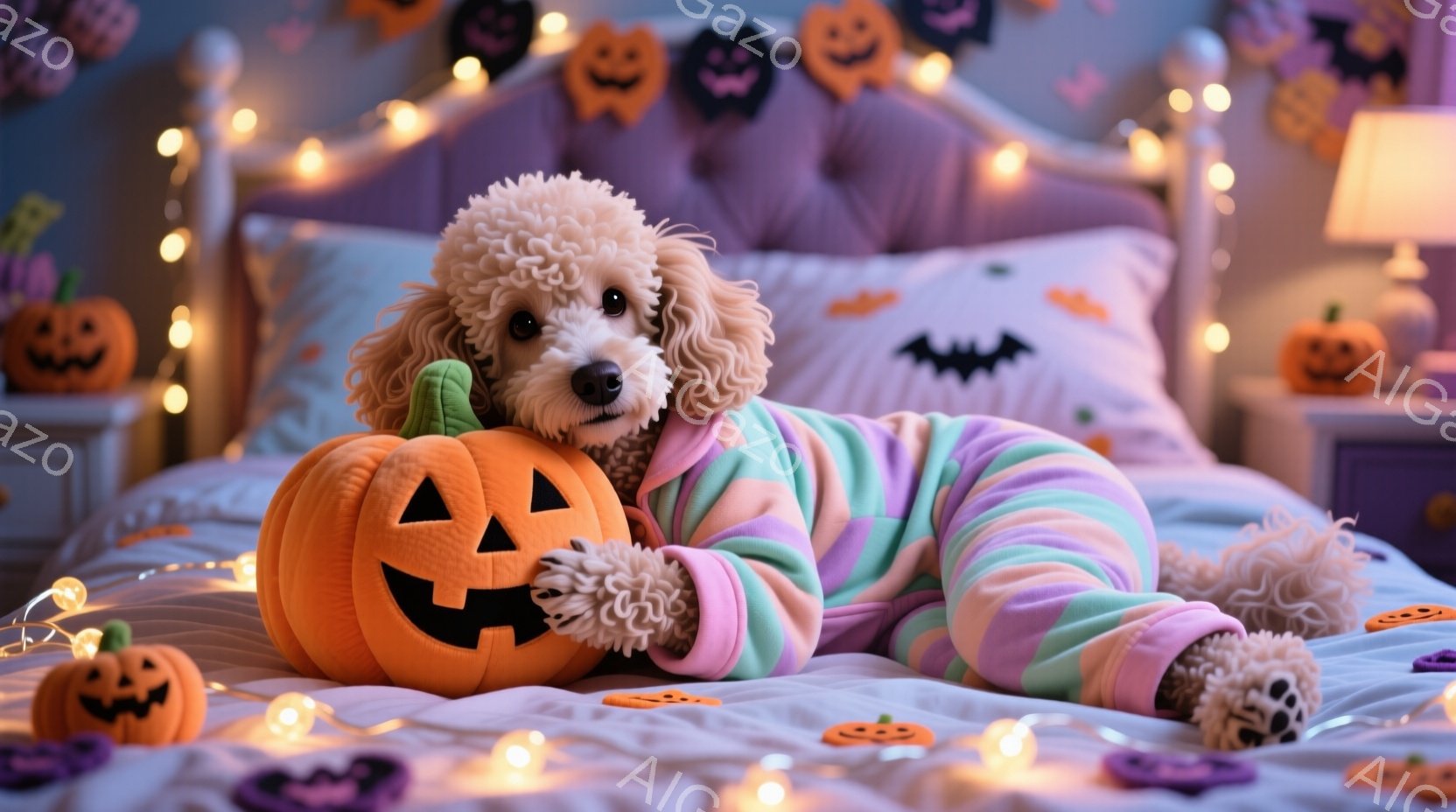 白い巻き毛の犬が、ハロウィーンをテーマにしたパステルカラーのパジャマを着てベッドに横たわっています。大きなカボチャのぬいぐるみを抱き、リラックスした表情でカメラを見ています。背景にはハロウィーンの装飾が施されたベッドルームが広がっており、温かく楽しい雰囲気が漂っています。