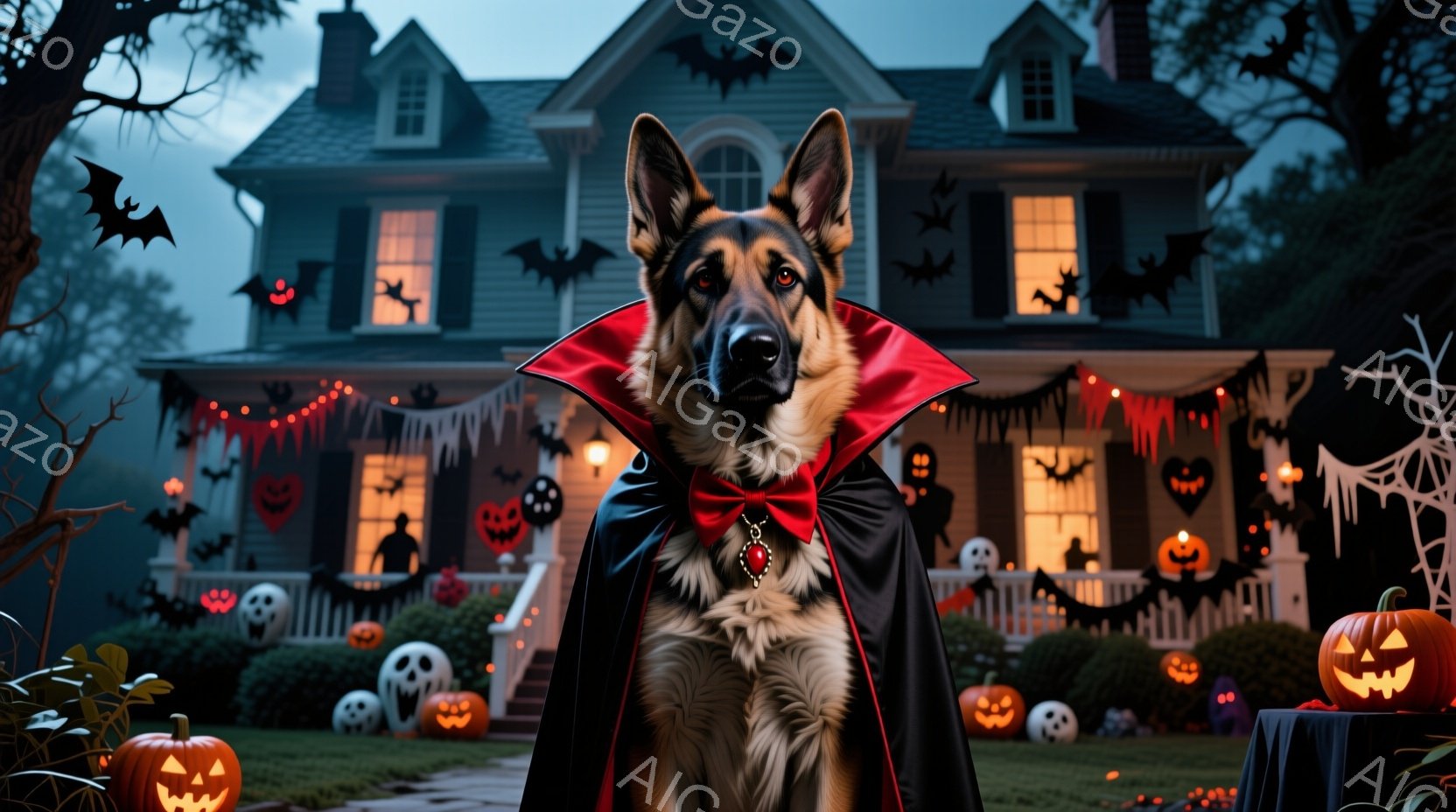 ドイツシェパードがハロウィーンの衣装である黒いマントと赤い襟を身に着けて正面を見つめています。その表情は嬉しそうで、少し口を開けています。背景には、カボチャや骸骨で飾られたハロウィーンの家があり、夜空にはコウモリが舞っています。