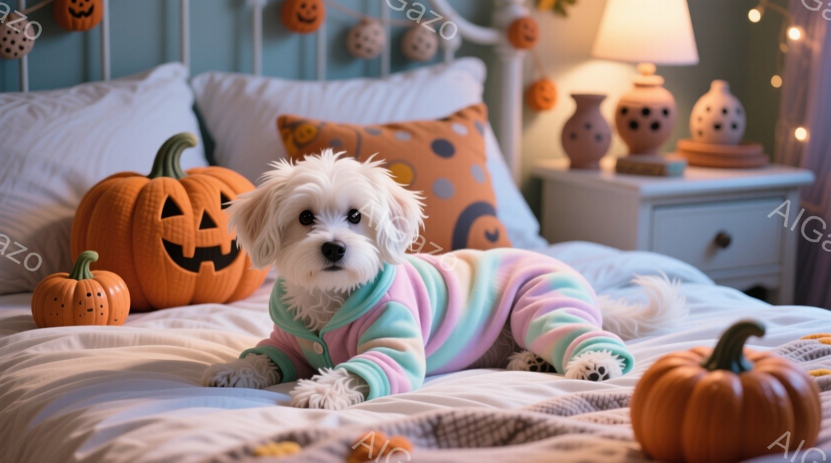 白い毛並みの小型犬が、パステルカラーのパーカーを着てベッドに横たわっています。犬はリラックスした表情で、前足を伸ばし、穏やかな雰囲気です。背景にはハロウィーンを連想させるカボチャの装飾が施され、ベッドサイドテーブルにはランプとカボチャの置物が置かれています。