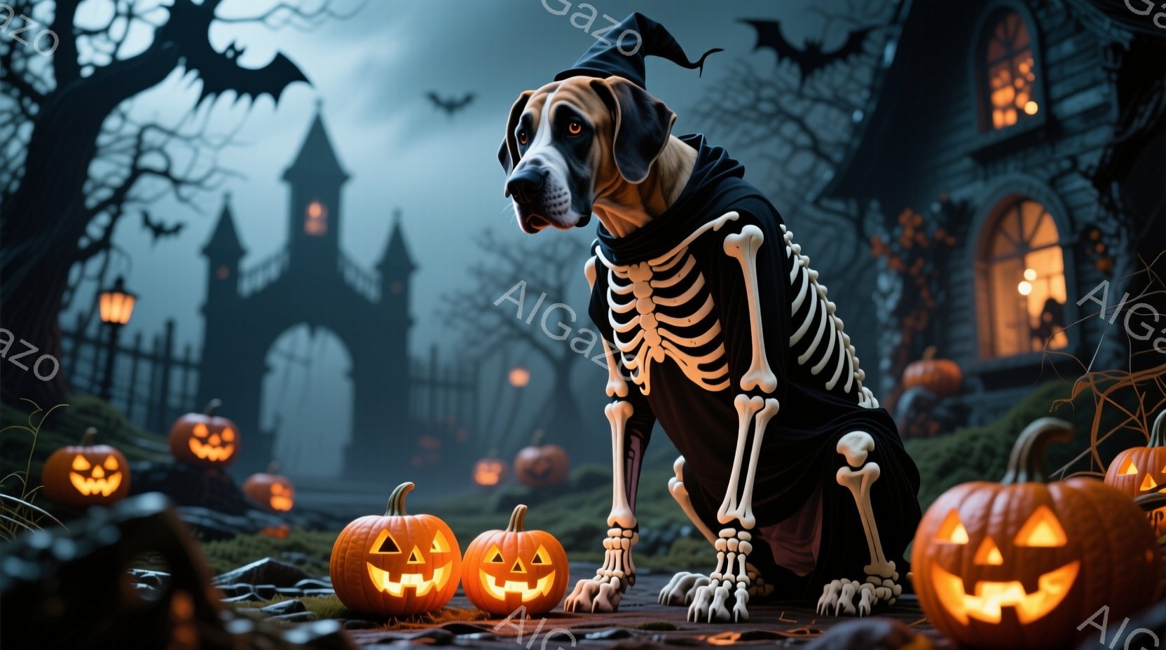 ハロウィーンの夜を思わせる暗く不気味な雰囲気の中で、骨の模様が描かれた服を着た犬が立っている様子を描写しています。背景には、ジャック・オー・ランタンが灯り、黒いフェンス、暗い木々、遠くに見える建物があり、暗闇に浮かぶコウモリが不気味さを強調しています。犬は前足を少し前に出し、自信を持って立っており、ハロウィーンの雰囲気にぴったりの愛らしい姿です。