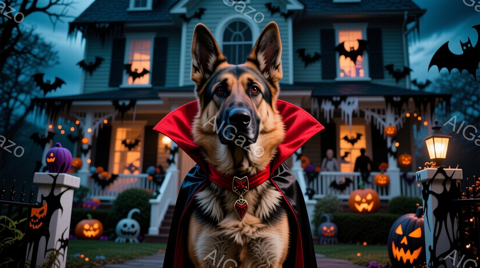 ハロウィーンの夜を舞台に、黒いマントと赤いリボンタイを身につけたジャーマンシェパードがカメラを見つめている。背景には、カボチャランタンや幽霊の飾り付けが施された、不気味な屋敷がライトアップされており、夜空には満月が輝いている。全体的に、ユーモラスで楽しいハロウィーンの雰囲気が漂っている。