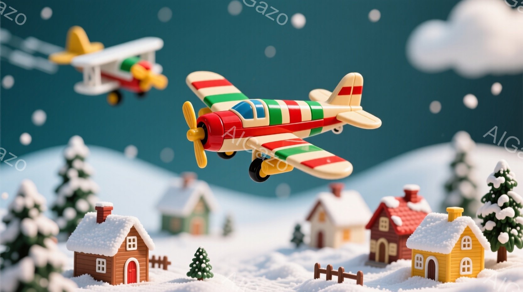 雪景色の中に、ミニチュアサイズの家々が並び、赤い帽子をかぶった人物が立っている。空には、カラフルなプロペラ機が2機飛び、雪が舞っている。全体的に、温かく、クリスマスの雰囲気を感じさせる、可愛らしい情景である。