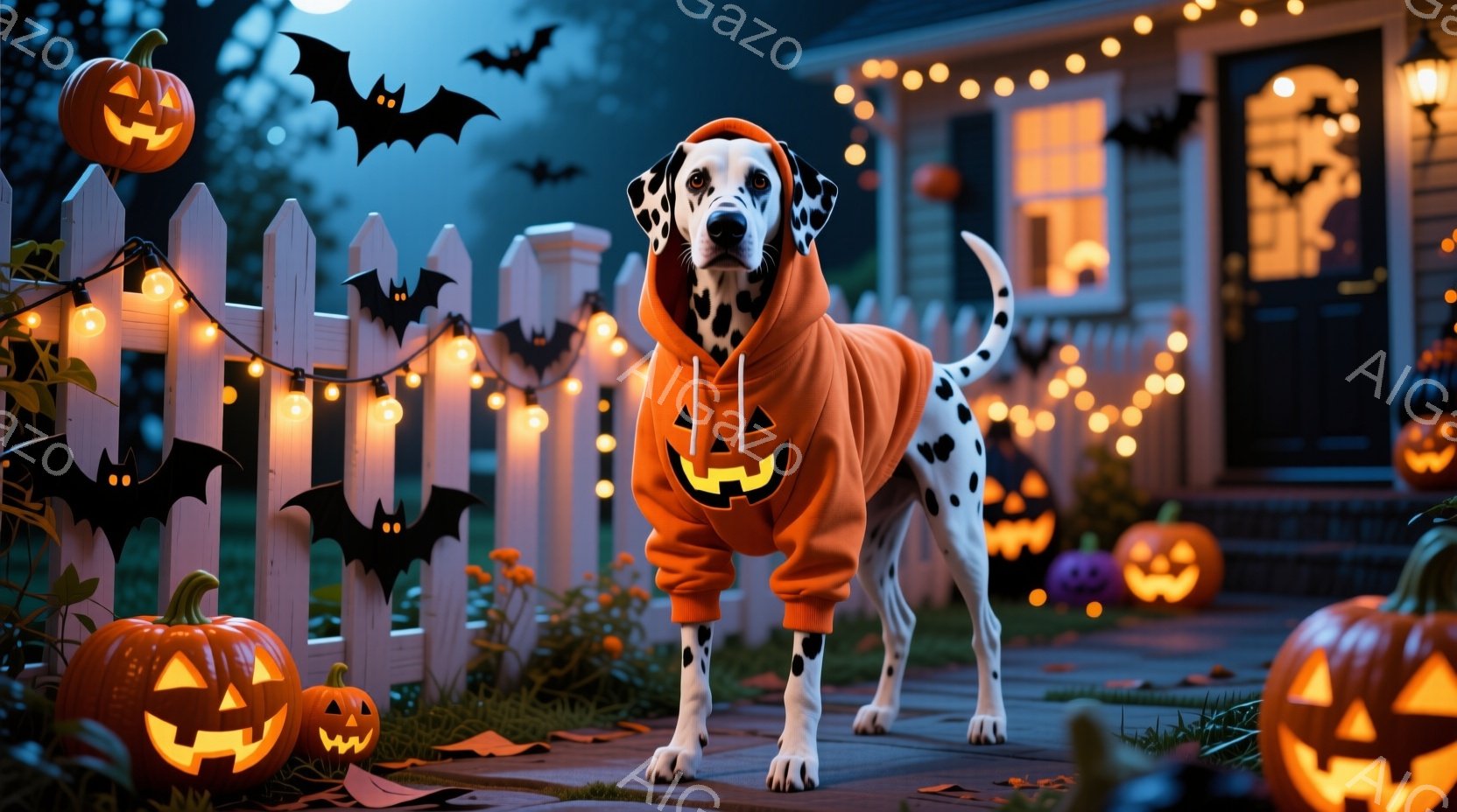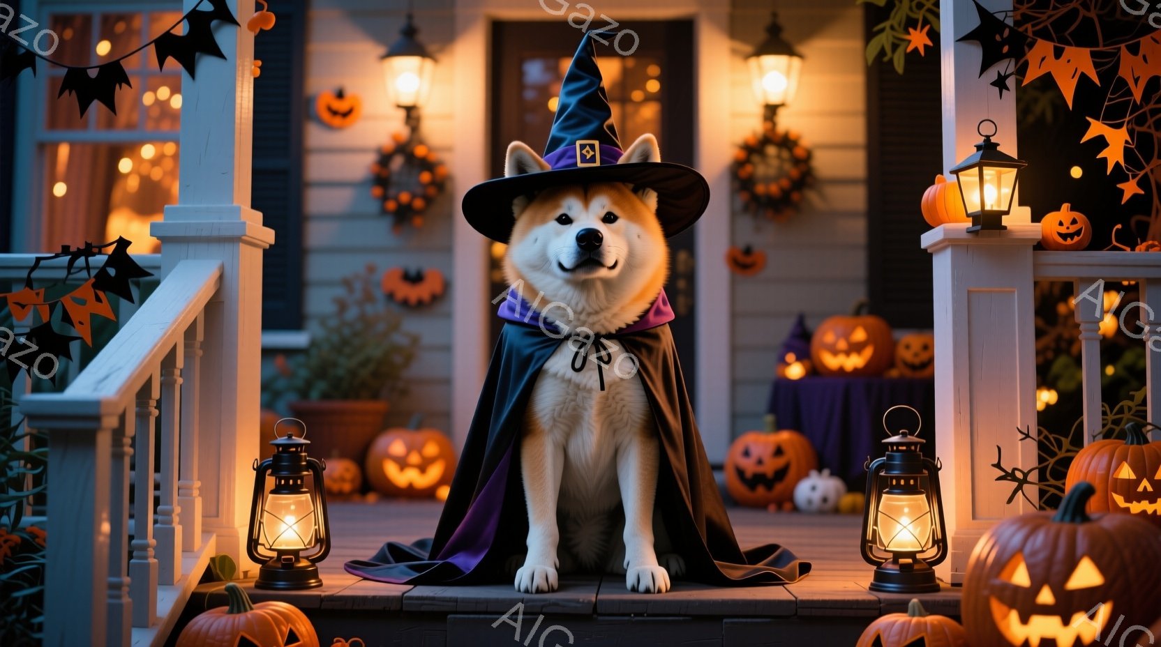 白と黒の毛並みを持つ犬が、ハロウィーンの衣装である黒いマントと先の尖った帽子を身につけ、家の玄関のステップに座っています。周囲には、ジャック・オー・ランタンやオレンジ色の飾り付けが置かれ、家のポーチはハロウィーンの装飾で彩られています。暖かく、お祝いムード溢れる、秋の夜のハロウィーンの雰囲気です。