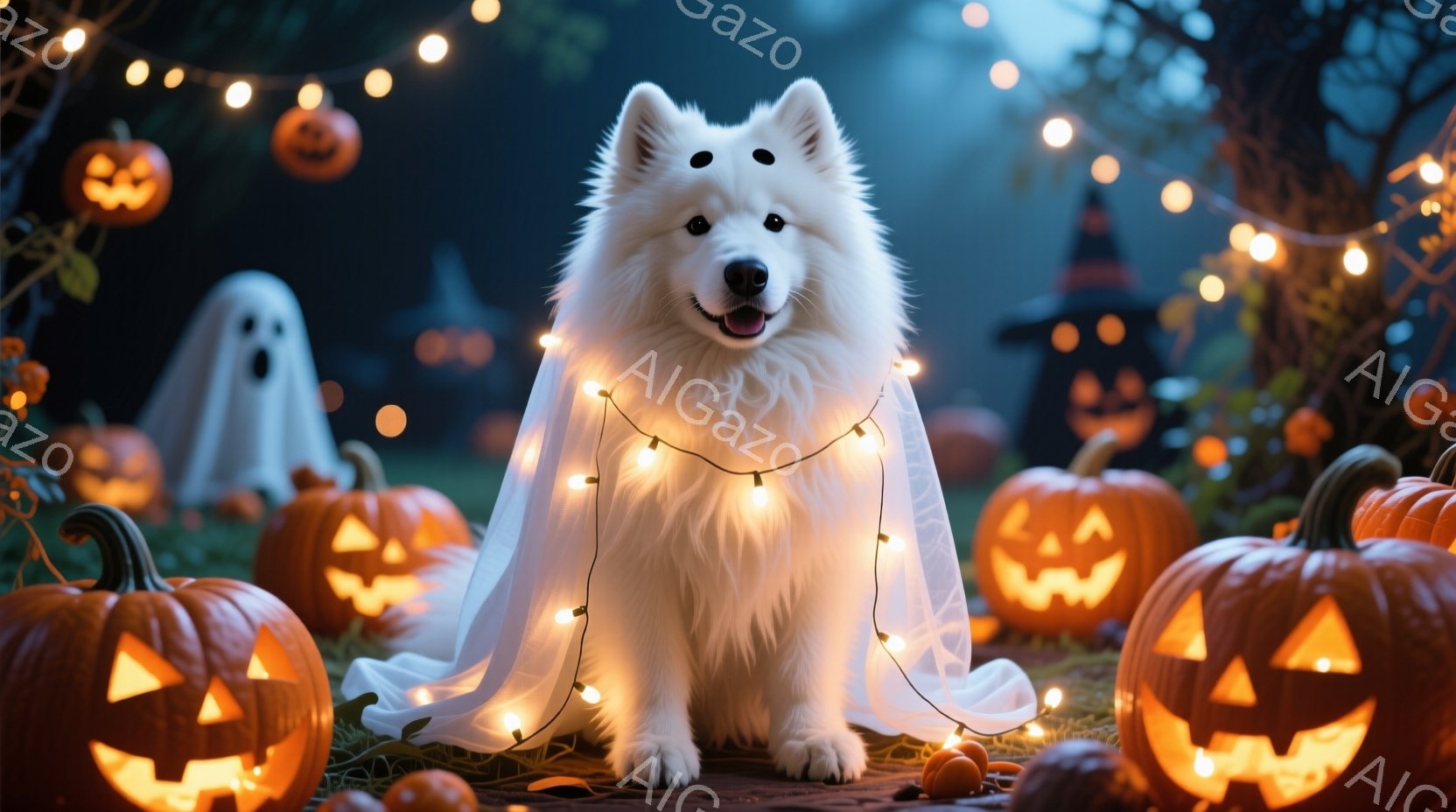 この無料AI生成画像「白い巻き毛の犬が、ハロウィーンの衣装であるカボチャの形をした装飾を身につけ、白いマントを羽織って座っています。背景には、燃える暖炉、様々なカボチャのランタン、ハロウィーンをテーマにしたガーランドや装飾が配置され、お祝いムードが高められています。全体的に暖かく、お祭り気分満載で、愛らしい光景です。」は、2025年10月24日に作成されました。 サイズは 1664×928px の高解像度で、商用利用も可能なフリー素材として提供しています。