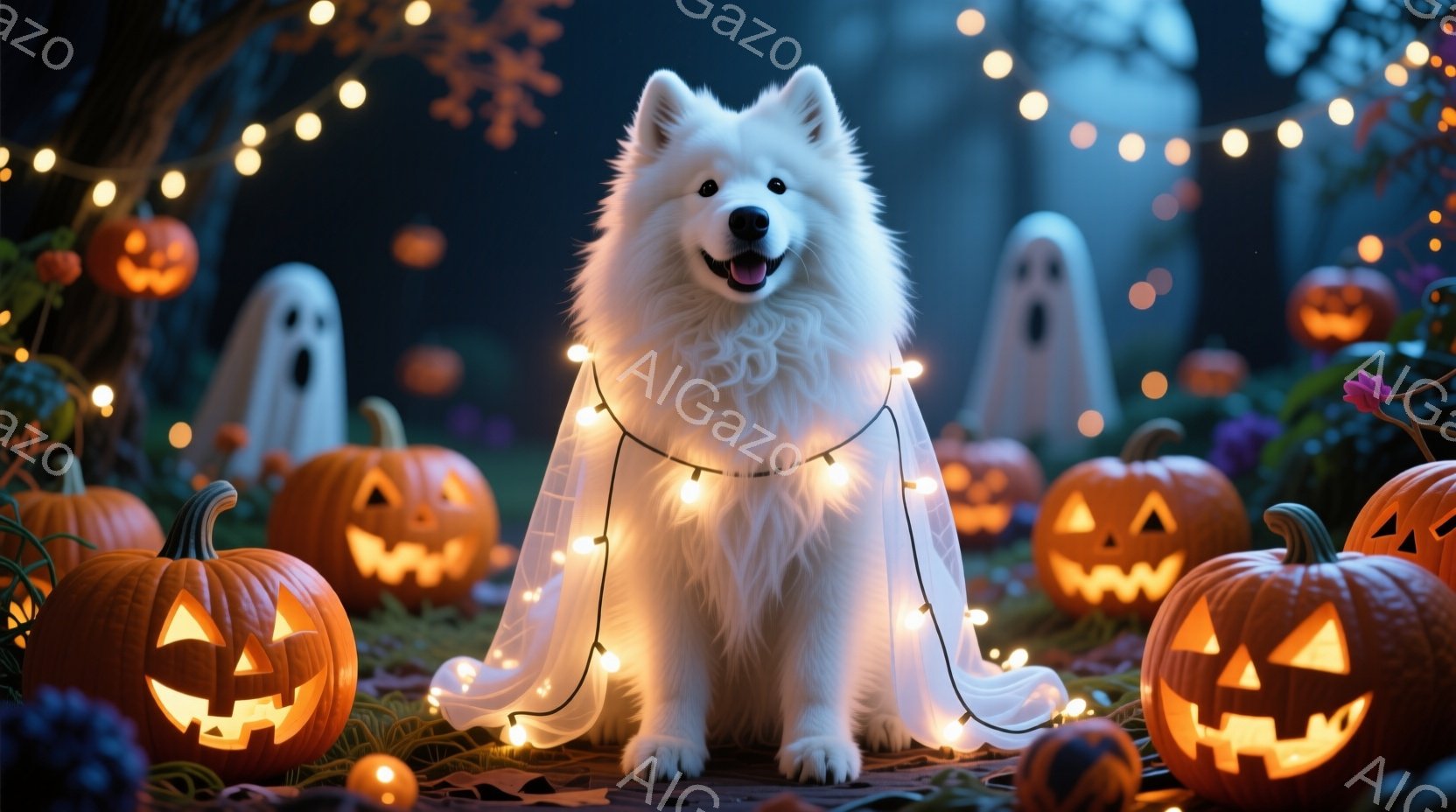 白い毛並みの大型犬が、ハロウィーンらしい白い布をマントのように羽織り、満面の笑みを浮かべて座っています。背景には、ジャック・オー・ランタンや幽霊の装飾が並び、暖かい光のイルミネーションが輝き、夜のハロウィーンの雰囲気を盛り上げています。全体的に、愉快で温かいハロウィーンの祝祭の様子が表現されています。