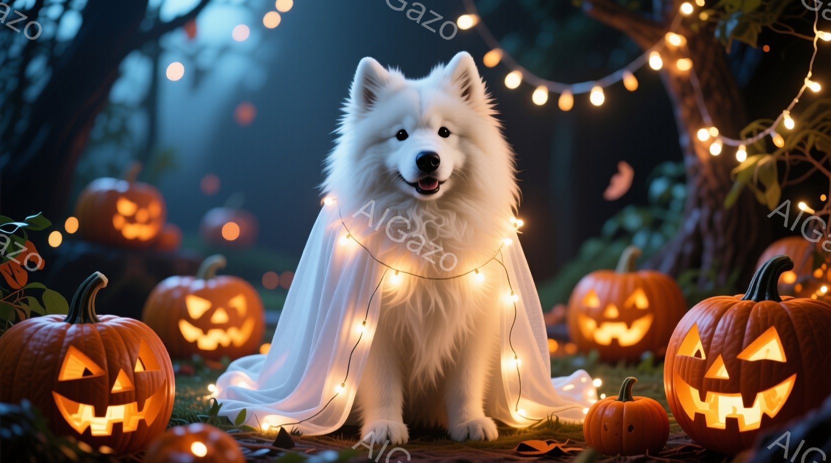 白い毛並みのグレイハウンドが、黒いマントを羽織って立っている。背景には、ゴシック様式の窓と、点灯したランタンが並び、薄暗く神秘的な雰囲気を醸し出している。マントをまとった犬の姿とランタンの光が、ハロウィーンや怪談を連想させるような、少し不気味で幻想的な光景を作り出している。