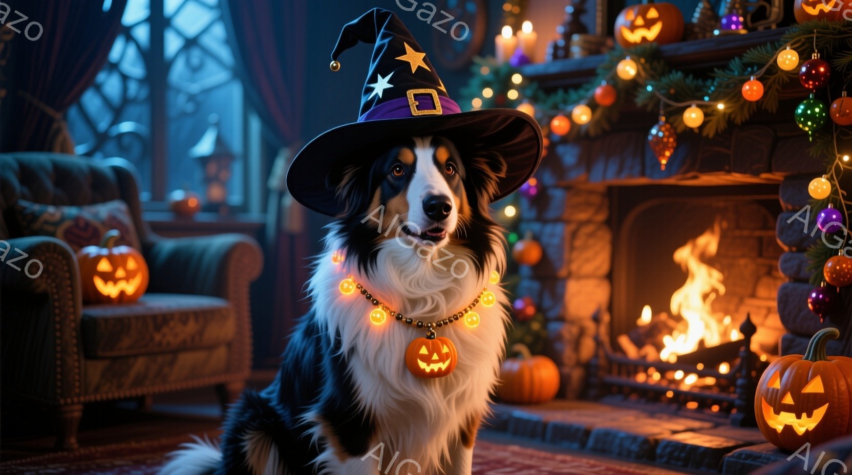 黒と白の毛並みを持つ美しいボーダーコリーが、ハロウィーンをテーマにした装飾が施された暖かいリビングルームに座っています。黒い魔女帽子をかぶり、オレンジ色のカボチャの飾り付きの首輪をしています。暖炉の炎とハロウィーンのランタンが室内に温かく幻想的な雰囲気を作り出しています。