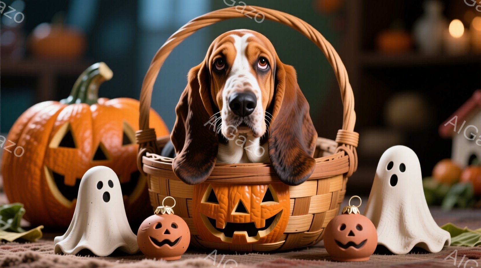 かぼちゃの彫刻と幽霊の置物が置かれたバスケットの中に、ブラッドハウンドが座っています。犬は落ち着いた表情でカメラを見つめ、周りのハロウィーンの装飾と暖色の照明が温かく楽しい雰囲気を醸し出しています。背景には、ぼやけた家具や装飾が確認でき、室内の居心地の良い空間を示唆しています。