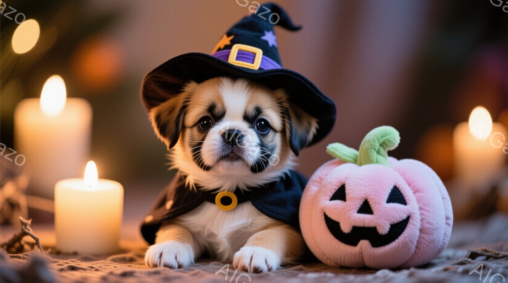 白と茶色の毛並みの子犬が、ハロウィーンらしい黒い帽子と衣装を着て、おもちゃのジャック・オー・ランタンのそばにうずくまっている。子犬は前足を伸ばし、少し上目遣いでこちらを見ている様子は可愛らしい。背景にはぼやけた光と、ハロウィーンを彩るキャンドルが配置され、温かく幻想的な雰囲気を醸し出している。