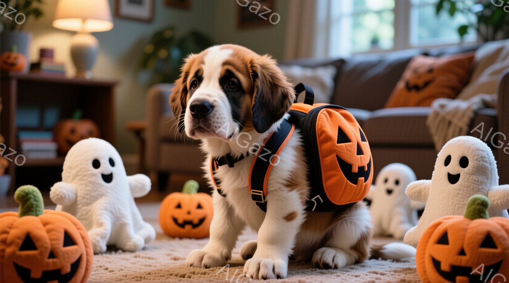 鮮やかなオレンジ色のカボチャのバックパックを背負った、愛らしいセント・バーナードの子犬が座っています。周りには、ふわふわの白い幽霊のぬいぐるみと、笑顔のカボチャの置物が置かれ、ハロウィーンの雰囲気を盛り上げています。背景には、暖色系のソファや本棚があり、室内は温かく居心地の良い空間となっています。