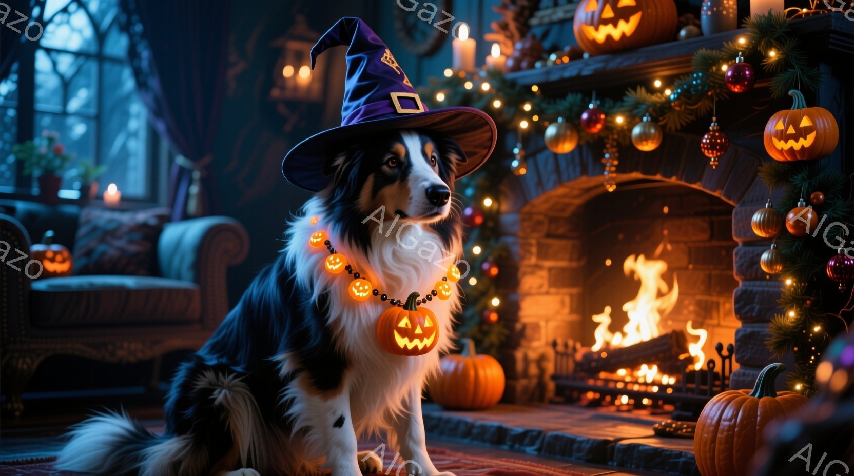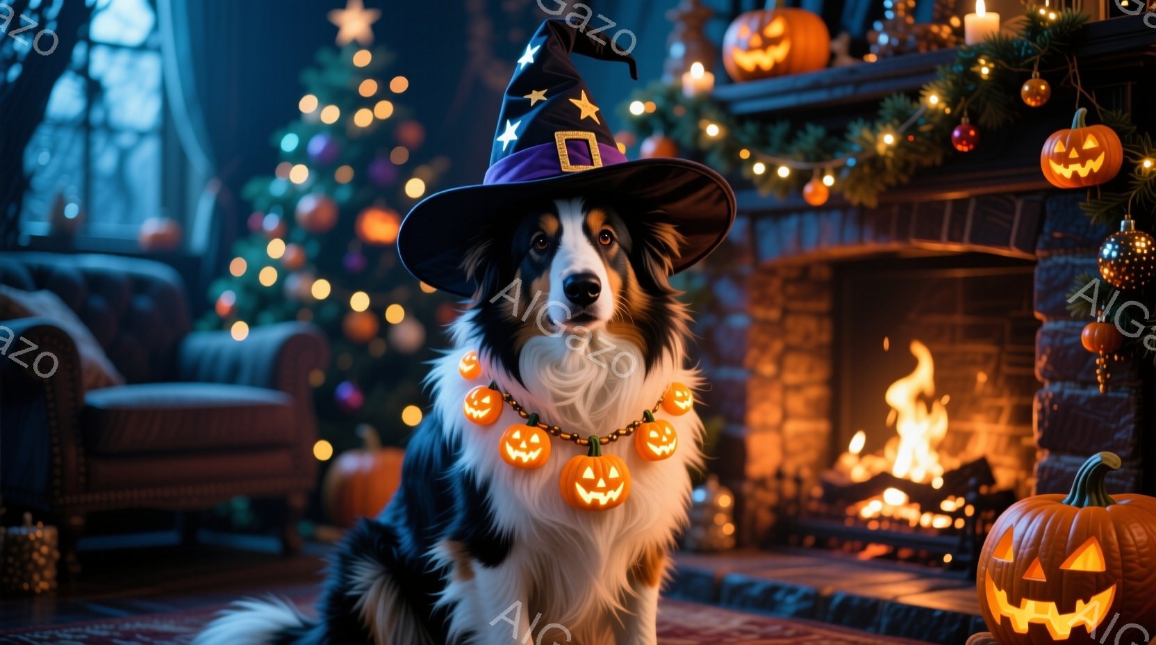 黒と白のボーダーコリーが、ハロウィーンをテーマにした装飾が施された室内で座っています。紫色の魔女帽子をかぶり、オレンジ色のカボチャの模様が入った首輪をつけており、正面を見つめて穏やかな表情を浮かべています。暖炉の火が暖かく照らし、背景にはカボチャや装飾されたクリスマスツリーが並び、ハロウィーンの楽しい雰囲気を醸し出しています。
