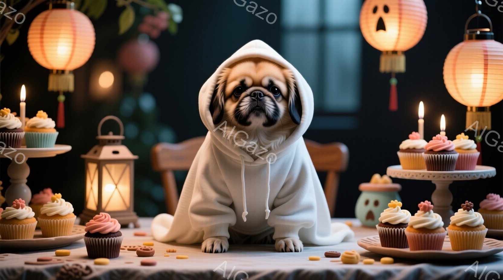 白い背景に、可愛らしいパグが幽霊のコスチュームを着て座っています。その表情は少し無表情で、まるでハロウィンのパーティーを楽しんでいるようです。周囲にはカラフルなカップケーキが置かれ、オレンジ色の小さなオブジェクトが散りばめられています。