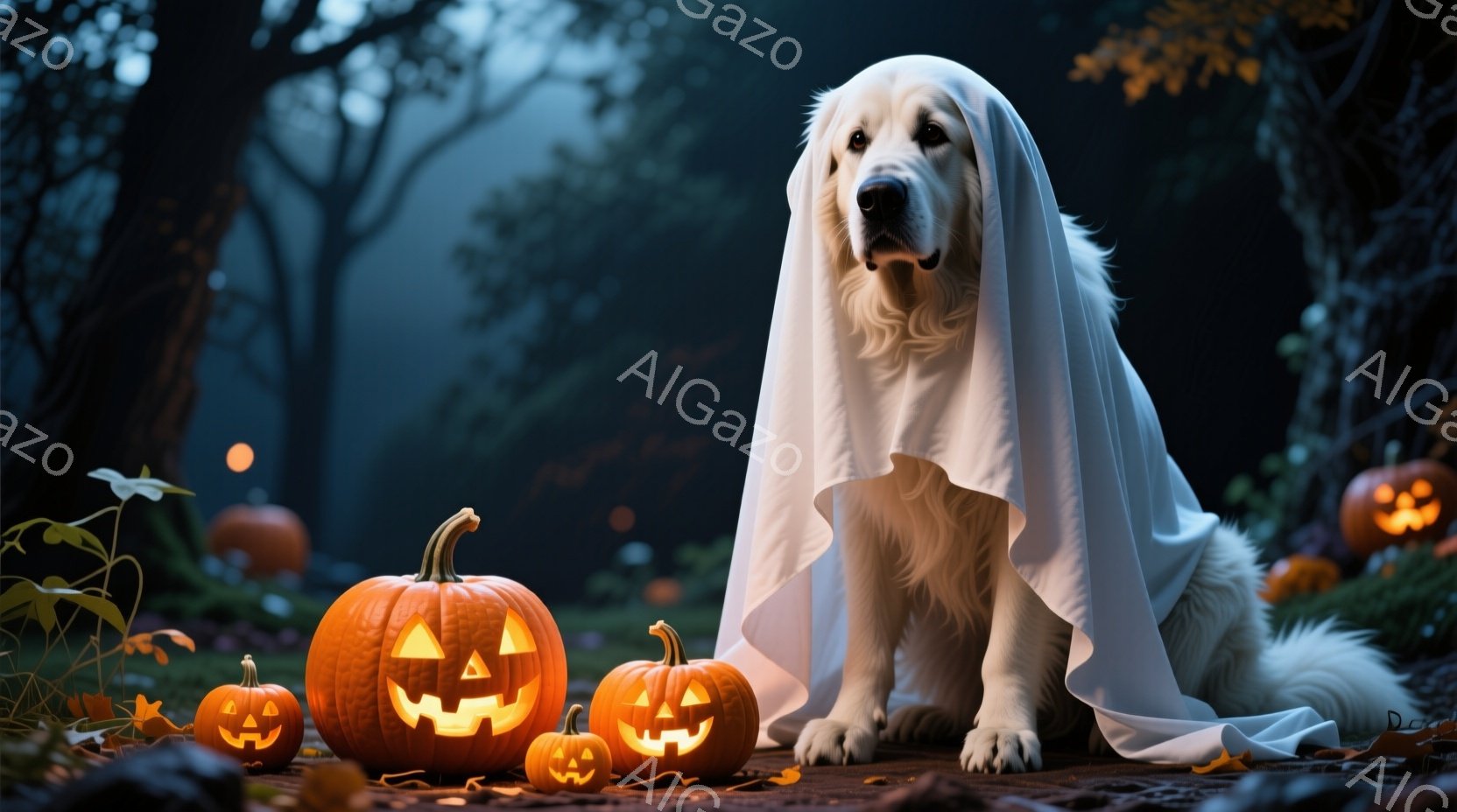 白い毛並みの大型犬が2匹、ハロウィーンの飾り付けられた背景に座っています。1匹は白い布を被り幽霊の仮装をしており、もう1匹は自然な姿で、どちらも穏やかな表情をしています。背景にはカボチャのランタンや落ち葉が散らばり、暗い森の中の幻想的なハロウィーンの雰囲気を醸し出しています。