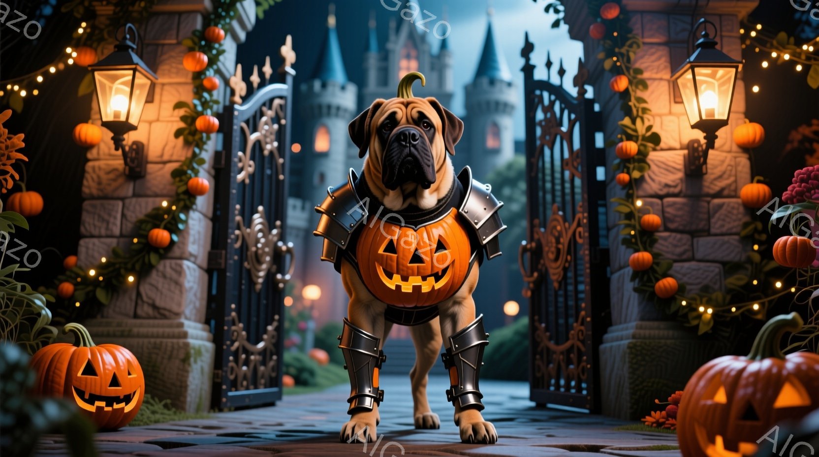大きな犬がハロウィーンの衣装を着て、石造りのゲートの前に立っている。その衣装はカボチャを模した胸当てと、脚に装着された鎧のような装飾が特徴的で、ハロウィーンの雰囲気を高めている。背景にはお城のような建物と、カボチャのランタンが並び、オレンジ色のライトが輝き、不気味で楽しいハロウィーンの夜を表現している。