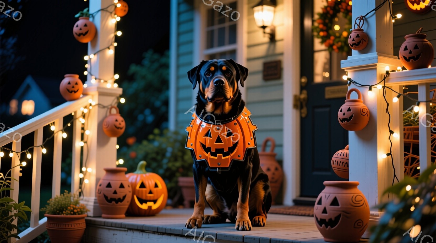 黒い犬がハロウィーンの衣装、つまりカボチャの形をしたベストを着て、家のポーチの階段に座っています。周囲には様々な大きさの照らされたジャック・オー・ランタンが置かれ、ポーチの柱にはオレンジ色のハロウィーンの飾りと電飾が施されています。ポーチと背景の家は、秋の夜の温かくお祝いムードを醸し出しています。