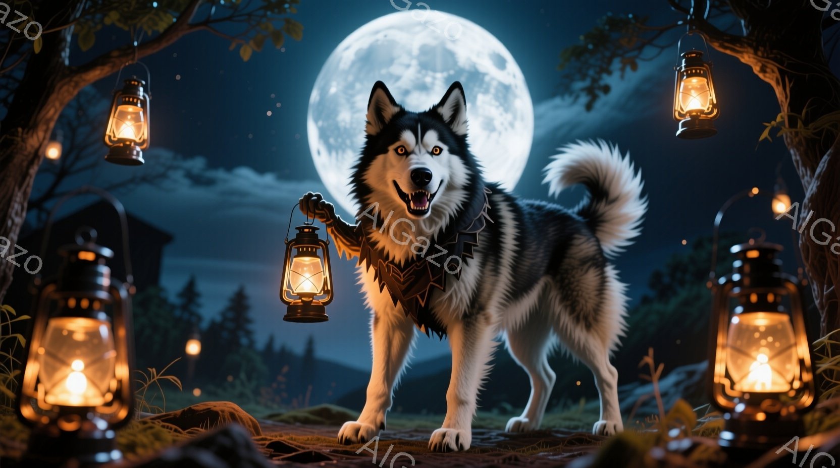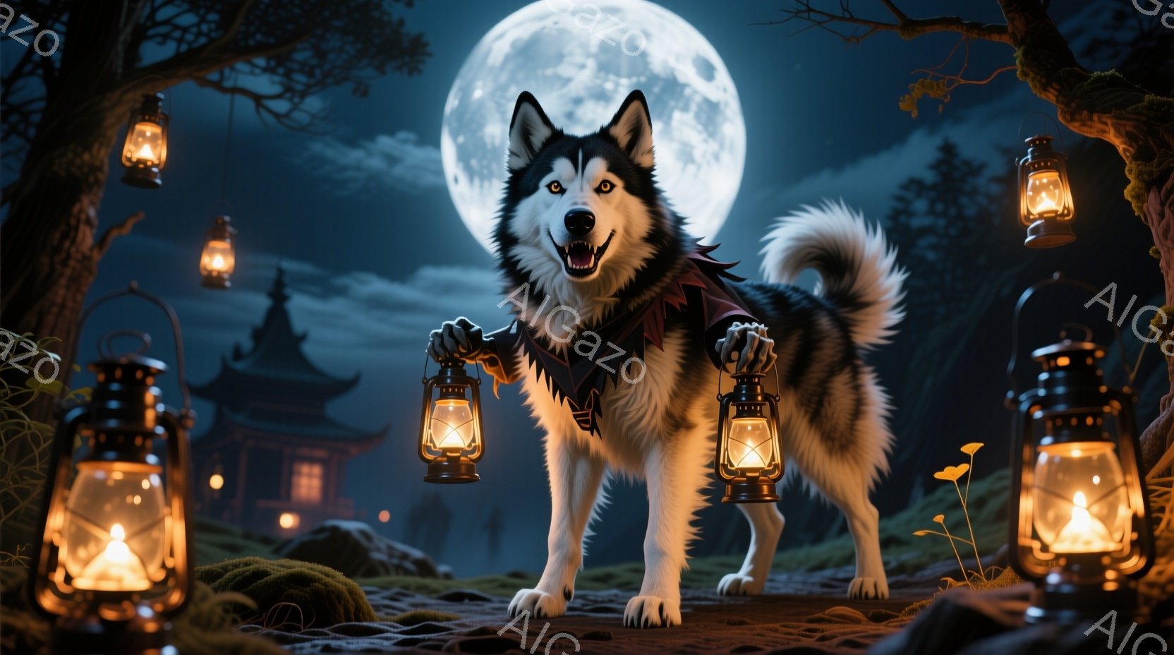 シベリアンハスキーが、黒と赤の鎧のような服を着て立っている。月明かりの下、口を開けて鋭い牙を見せ、威圧的な表情をしている。背景には暗い森が広がり、ランタンが灯され、神秘的で少し不気味な雰囲気を醸し出している。