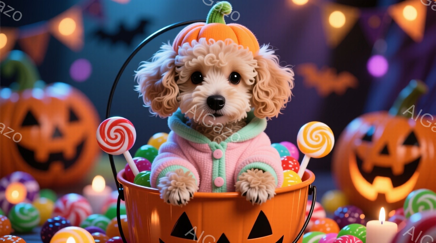 白い巻き毛の犬が、カボチャの形をしたバケツの中に座っており、ピンク色の可愛らしい服を着ています。周りにはカラフルなキャンディーが散らばり、背景には明るいオレンジ色のジャック・オー・ランタンが並んでいます。全体的に、ハロウィーンの楽しい雰囲気が漂う、暖かく魅力的なイメージです。