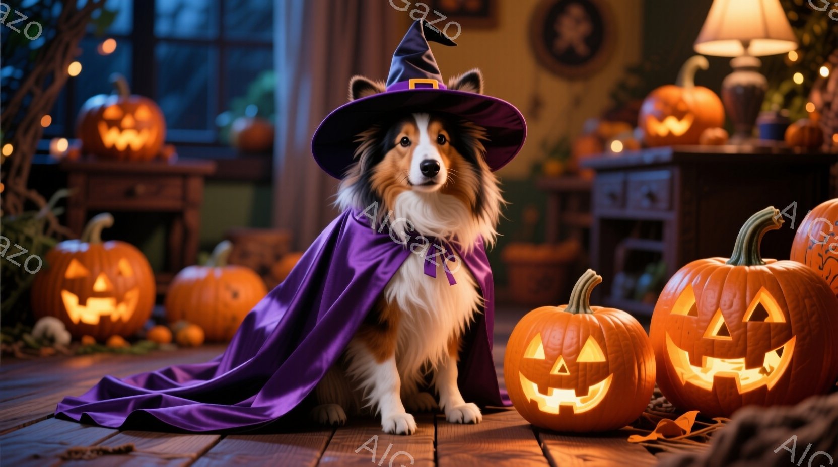 長毛のボーダーコリーが、紫色のマントと魔女帽子を身につけて座っています。背景には、ハロウィンらしいくり抜かれたカボチャがいくつか並び、木製の床に置かれています。全体的にハロウィンの夜の温かく、少し不気味な雰囲気が漂っています。