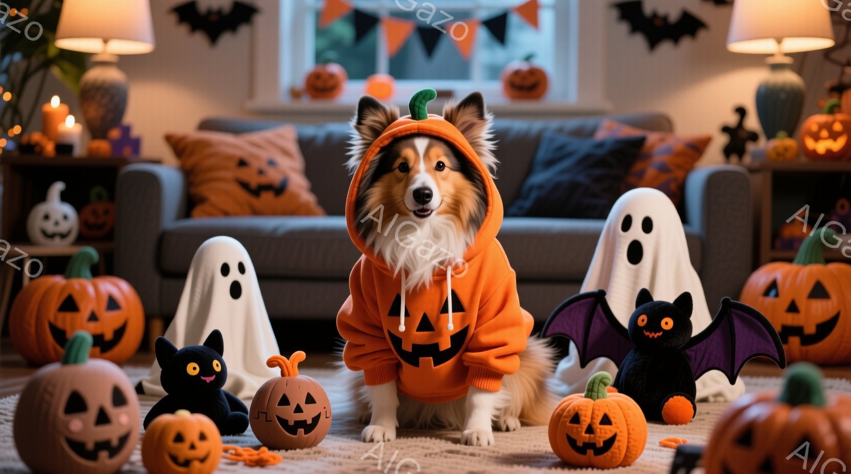 夜の遊園地で、トリコロールカラーの美しいボーダーコリーが正面をまっすぐ見て立っている。背景には、点灯された観覧車やゲームブース、そしてハロウィーンの飾り付けが施されたカボチャが並び、子供たちが楽しそうに遊んでいる様子がぼんやりと見える。全体的に、ハロウィーンの夜に賑わう遊園地の温かく、楽しい雰囲気が漂っている。
