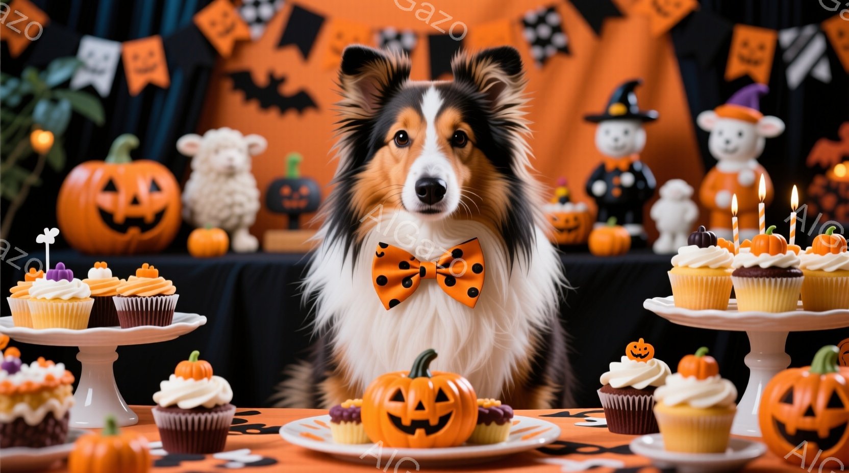 コリー犬がオレンジ色の蝶ネクタイをつけ、正面を見つめています。背景にはハロウィーンをテーマにした飾り付け、カボチャ、お菓子が並び、お祝いムードを演出しています。全体的に暖かく、遊び心のある雰囲気で、ハロウィーンパーティーのワンシーンを切り取ったようです。
