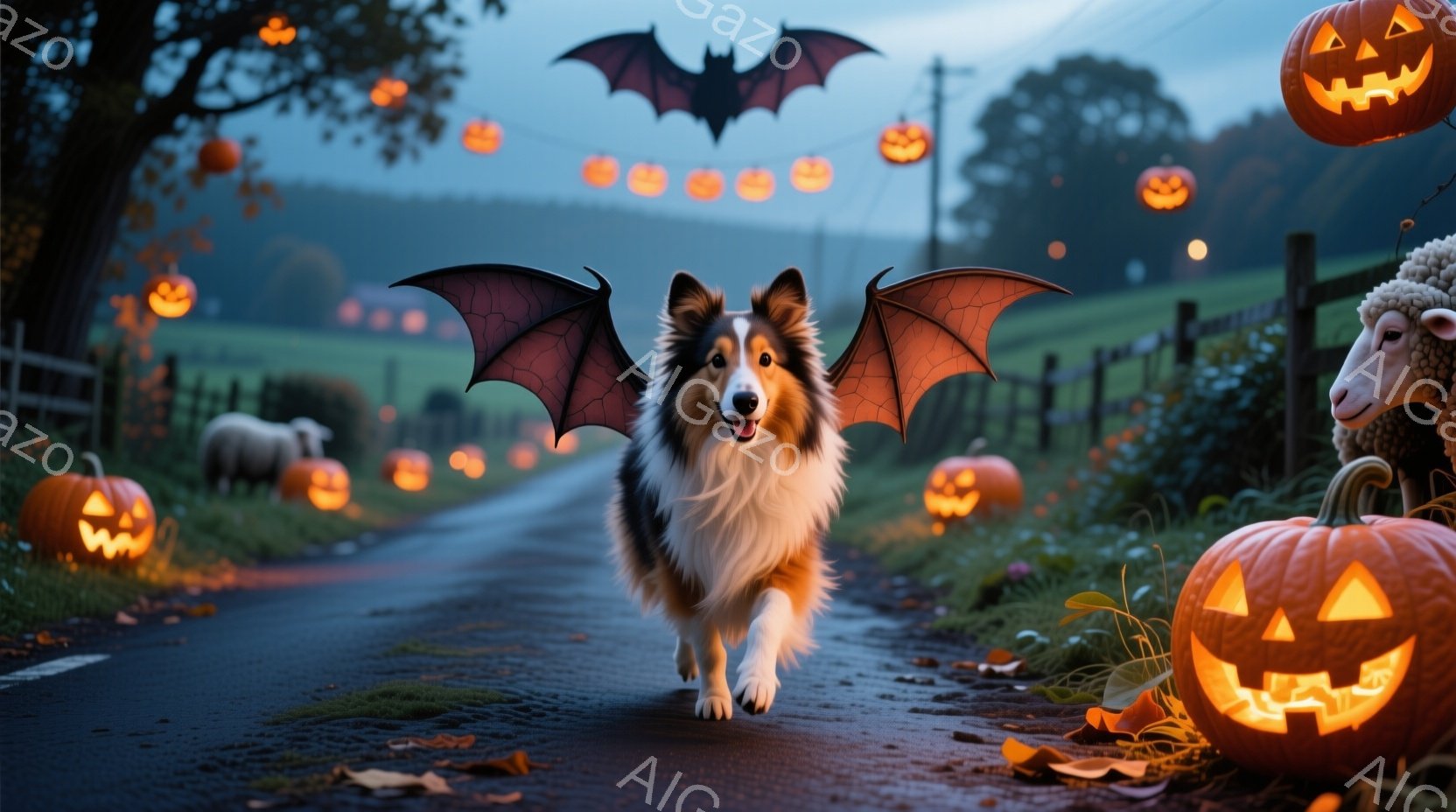 広大な牧草地を抜ける道には、ハロウィーンの装飾であるジャック・オー・ランタンが並び、その中央をコリー犬がバットマンのように翼を付けて駆けている。犬は元気いっぱいで、楽しそうに前を見据えている。背景には緑豊かな草地と、夕焼け空が広がり、穏やかで幻想的な雰囲気を醸し出している。