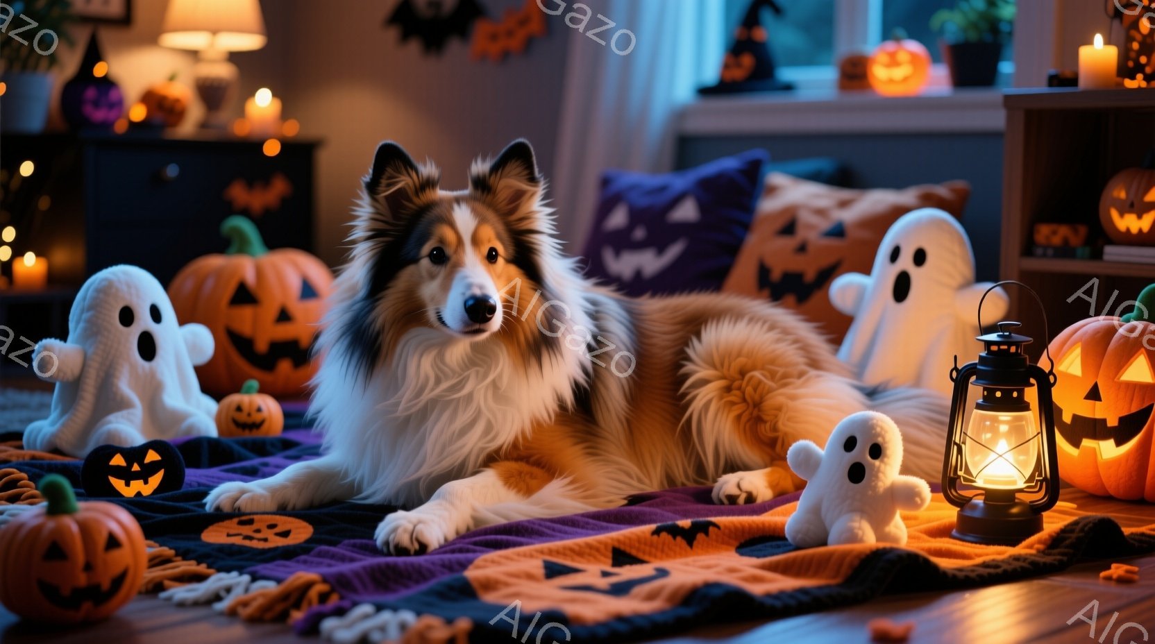 ボーダーコリーが、ハロウィンの装飾が施された道の中央をまっすぐに向かって歩いています。コリーには翼が取り付けられており、背後にはカボチャやお化け、コウモリが浮かび、ハロウィンの雰囲気を盛り上げています。道沿いにはカボチャのランタンが並び、背景には緑豊かな丘と暗い空が広がり、少し不気味ながらも陽気な雰囲気を醸し出しています。