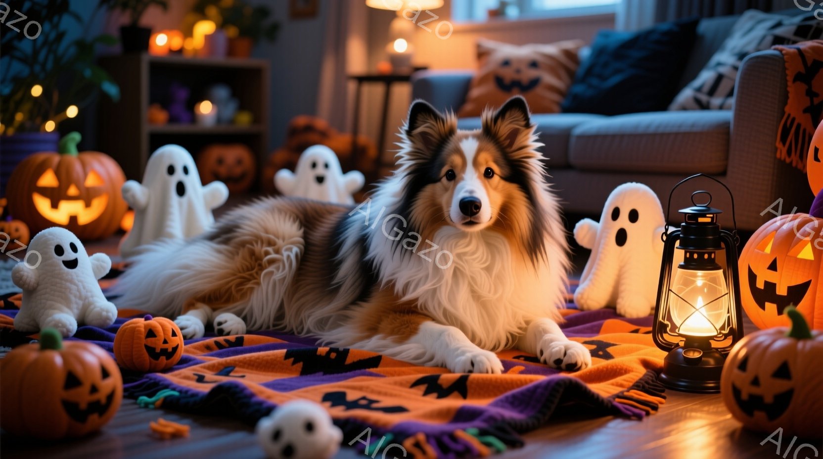 茶色と白のボーダーコリーが、ハロウィーンの魔女帽子をかぶり、庭に立っている。背景には、オレンジ色の光で飾られたハロウィーンの家があり、庭にはジャック・オー・ランタンが並べられ、空にはコウモリが舞っている。全体的に、ハロウィーンの夜の愉快で温かい雰囲気を感じさせる。