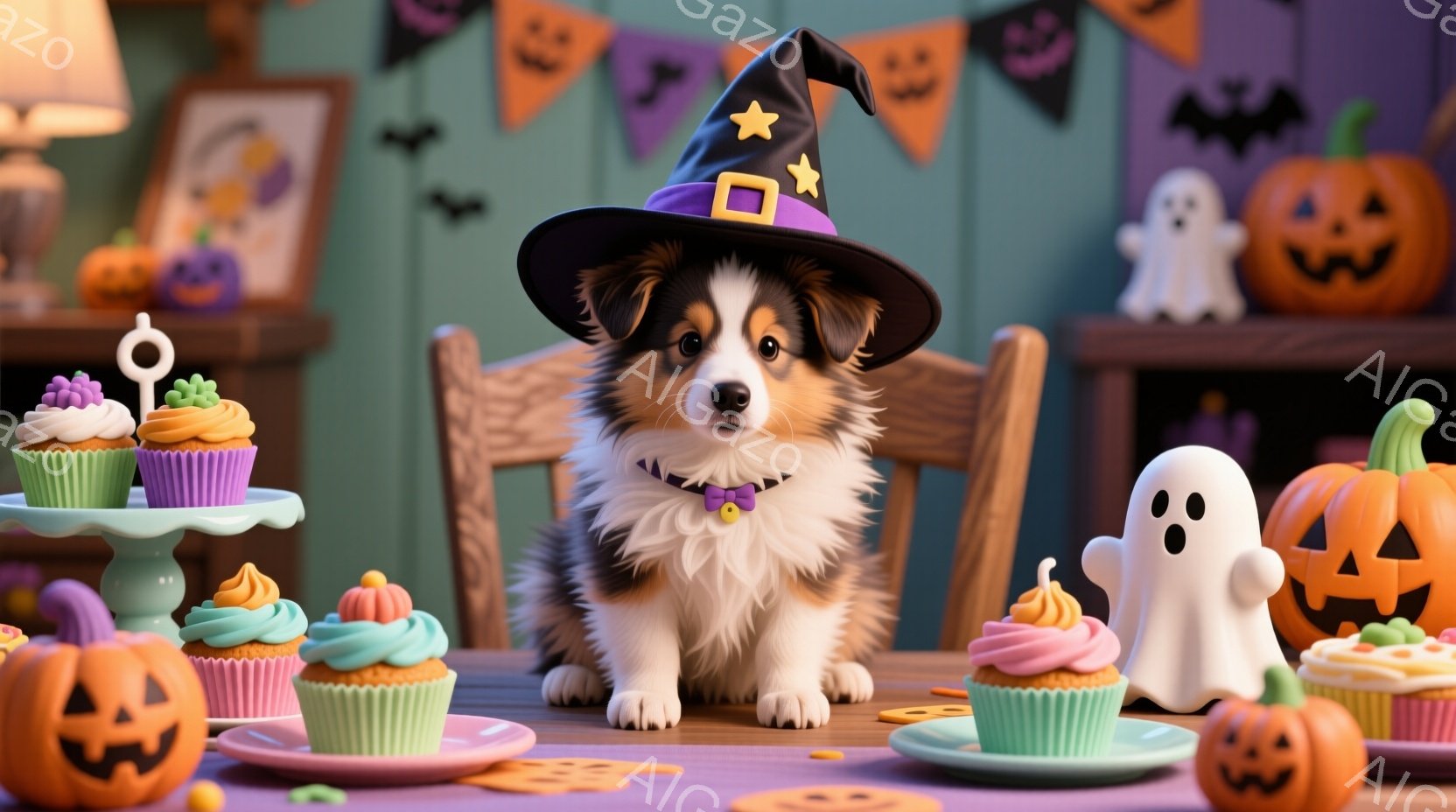 ハロウィーンの装飾が施された部屋で、帽子をかぶった茶色と白のボーダーコリーが描かれています。コリーはテーブルの前に座り、ハロウィーンをテーマにしたカップケーキや白いお化けの置物が並べられています。背景には、カボチャのランタンや紫色の背景が確認でき、全体的に明るくお祝いの雰囲気です。