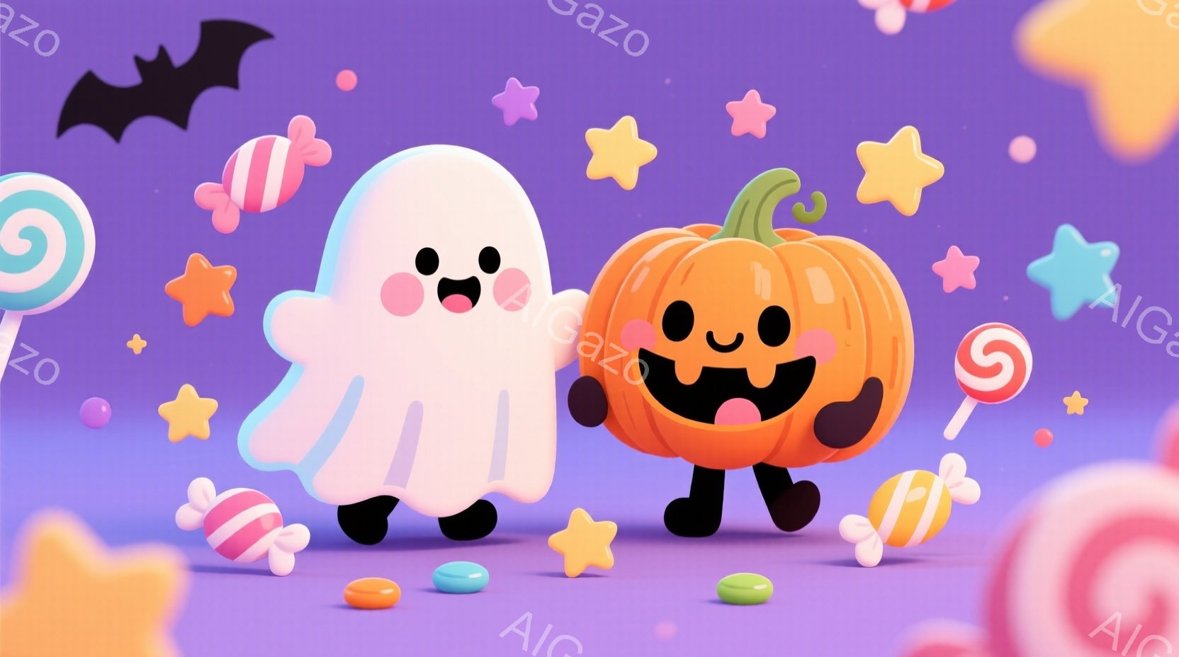 白い幽霊とオレンジ色のカボチャが寄り添って立っています。幽霊は青いキャンディを持っているようで、カボチャは緑色の葉っぱが付いています。背景には、様々な色の星やキャンディが散りばめられており、可愛らしいハロウィーンの雰囲気です。