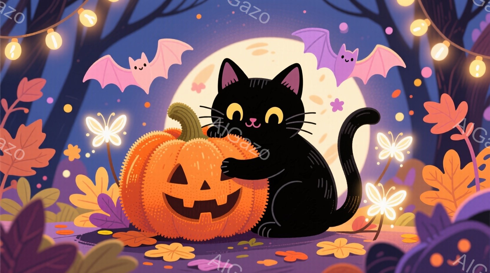 黒猫が大きなジャック・オ・ランタンの横に寄り添い、嬉しそうに微笑んでいます。背景には、オレンジや赤色の落ち葉、かわいらしいコウモリ、そして点灯したランプが散りばめられており、ハロウィンの温かく幻想的な雰囲気を醸し出しています。全体的に、秋の夜の穏やかで楽しい情景が描かれています。