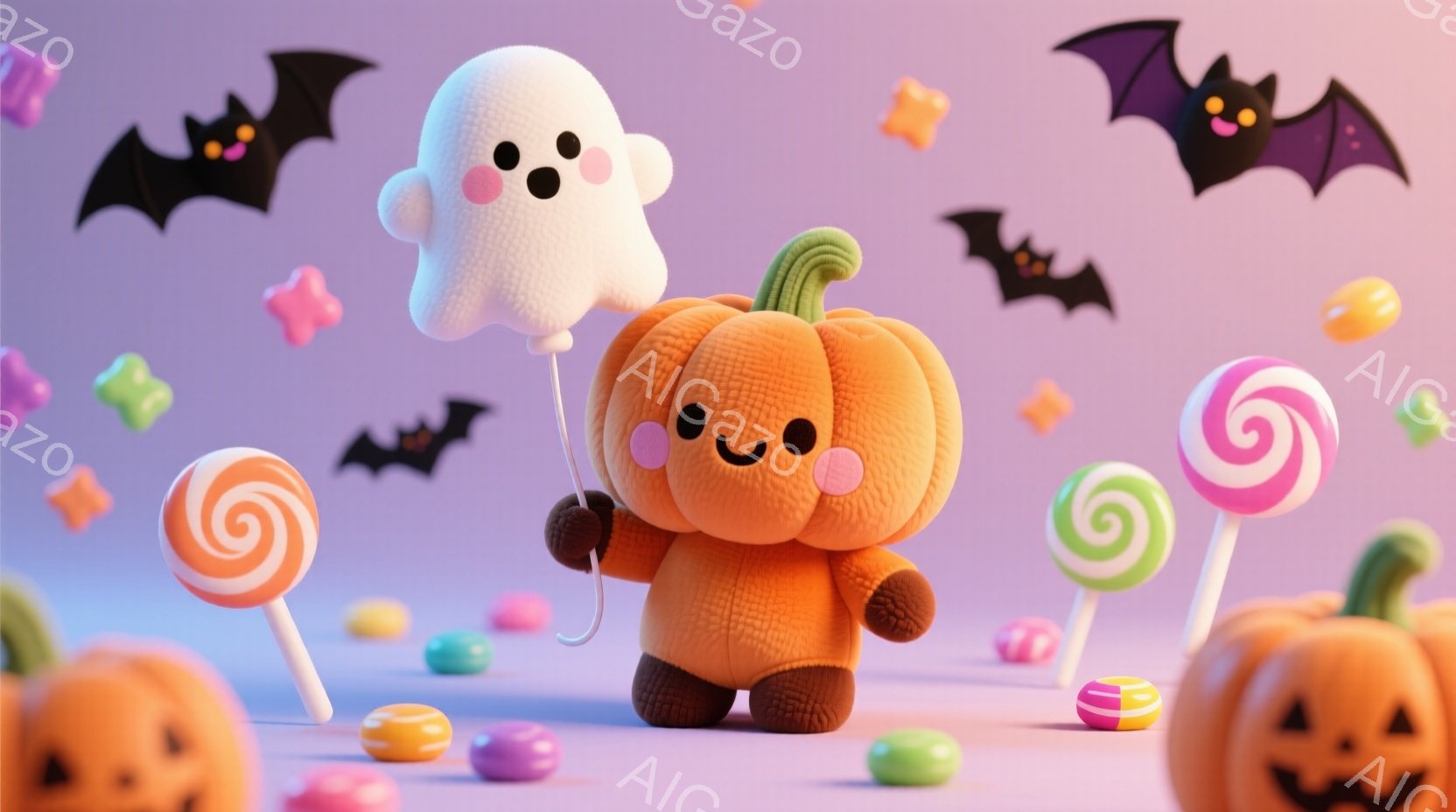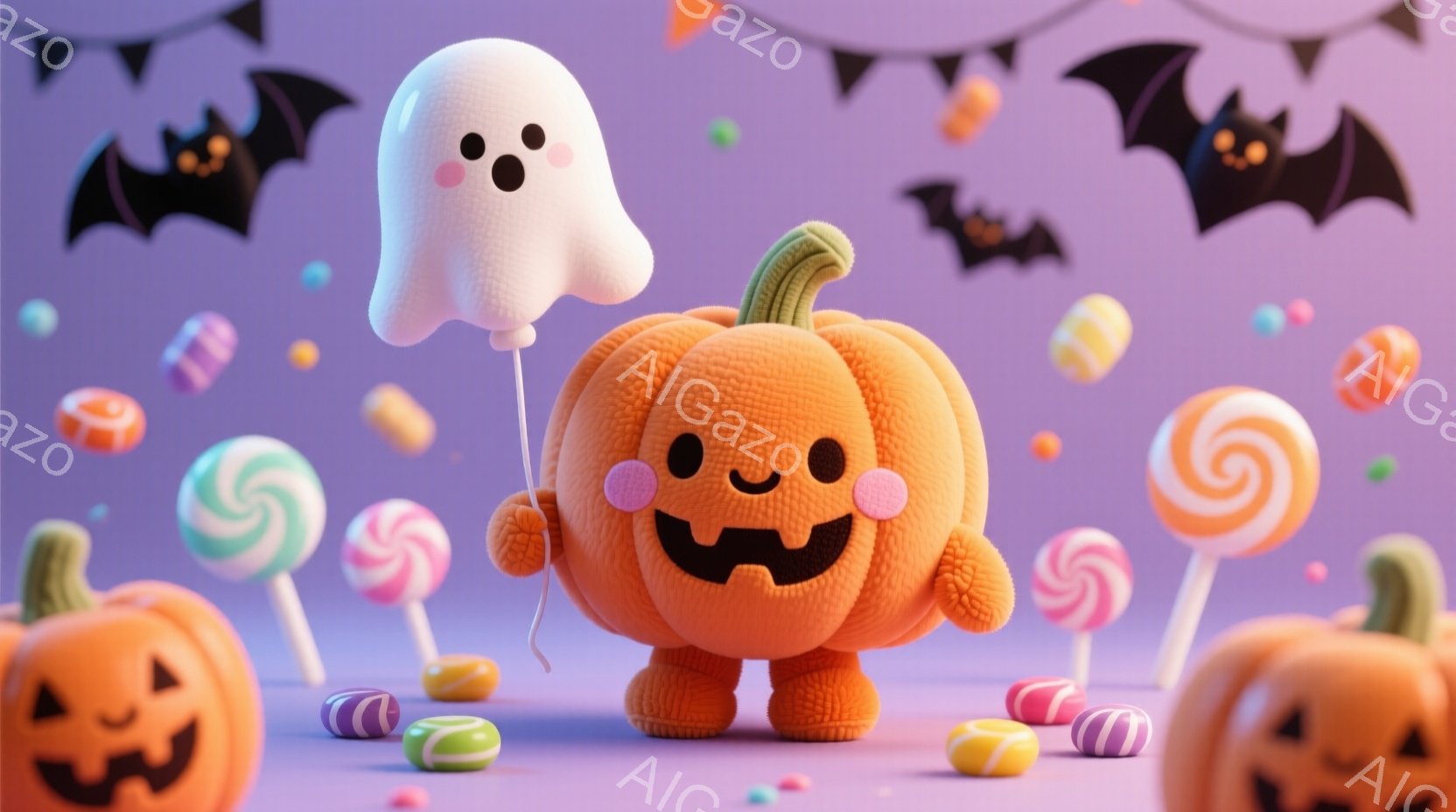 オレンジ色のカボチャの着ぐるみを着たキャラクターが、バルーンと幽霊のぬいぐるみを手に立っています。背景にはハロウィーンの飾り付けとして、カボチャのランタン、キャンディ、コウモリ、そしてカラフルな粒々が散りばめられています。全体的に明るく、お祭り騒ぎのような楽しい雰囲気です。
