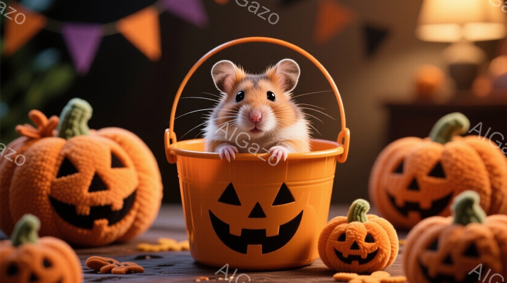 オレンジ色のハロウィーンのバケツに、小さなハムスターが可愛らしく座っています。ハムスターは前足をバケツの縁に出し、好奇心と少しの戸惑いが入り混じった表情で正面を見ています。背景には、様々な大きさのジャック・オ・ランタンが置かれ、暗い背景にぼんやりとした光が灯り、お祝いムードを醸し出しています。