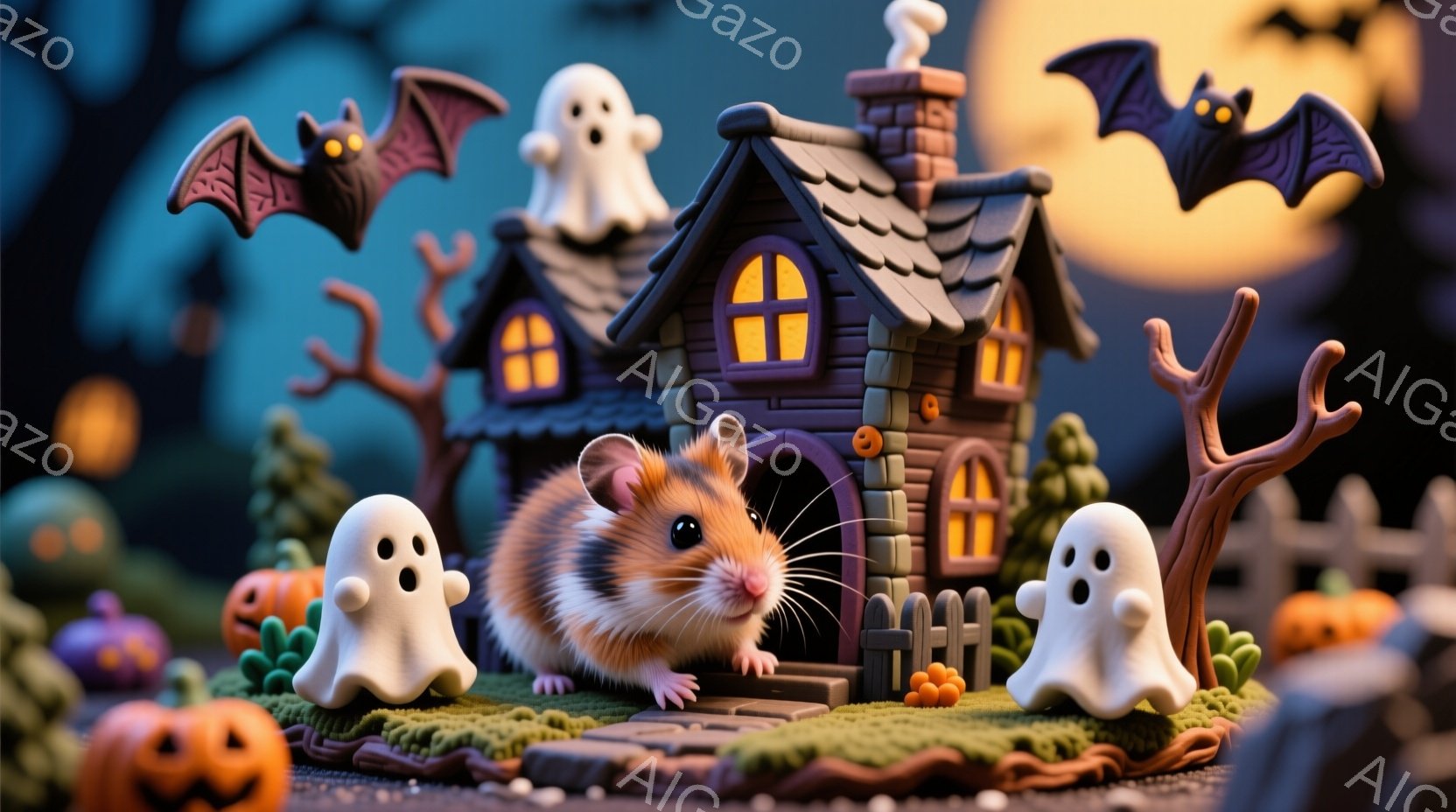 ハムスターが不気味なハロウィーンの風景の中にいます。背景には、幽霊、コウモリ、ジャック・オ・ランタン、不気味な屋敷、墓石が配置されています。全体的に、夜の暗さと明るいハロウィーンの装飾が対照的で、遊び心のある不気味な雰囲気を醸し出しています。