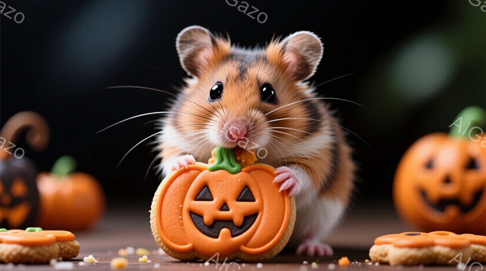 この無料AI生成画像「ハムスターが、ハロウィーンのデコレーションが施された芝生の上に立っています。紫色の屋根を持つ可愛らしい家と、浮かぶお化けやカボチャ、コウモリが背景にあり、夜空には満月が輝いています。全体的に、可愛らしく楽しいハロウィーンの雰囲気です。」は、2025年10月24日に作成されました。 サイズは 1664×928px の高解像度で、商用利用も可能なフリー素材として提供しています。
