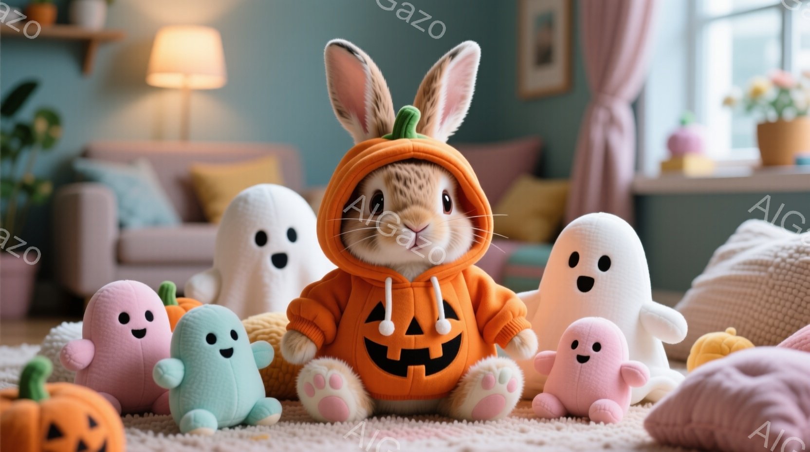 オレンジ色のカボチャの衣装を着た小さなウサギが、ふわふわの白い幽霊の人形に囲まれて床に座っています。背景には、ハロウィーンの飾り付けがされたリビングルームがあり、オレンジ色のカボチャのランタンや紫色の飾りなどが配置されています。全体的に、暖かく、可愛らしいハロウィーンの雰囲気が漂っています。