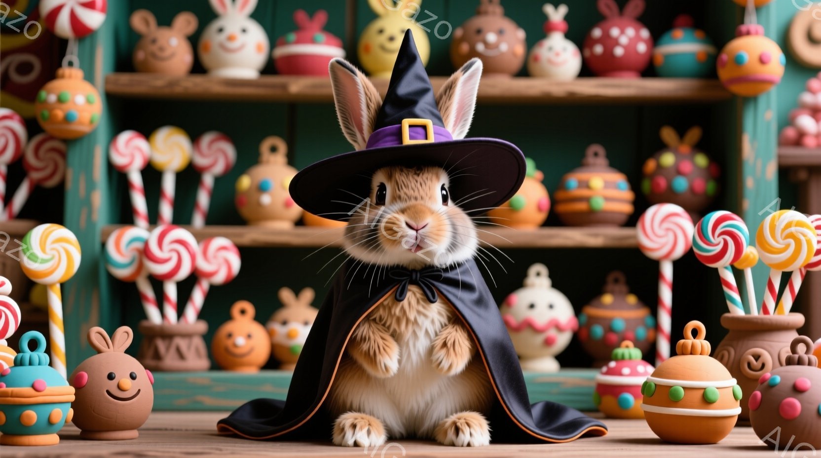 暖炉の棚のような木製の台の上に、魔法使いの帽子とマントを着たかわいらしい茶色のウサギが座っています。ウサギは前足を揃えて座り、つぶらな瞳でカメラを見つめており、穏やかで愛らしい表情をしています。背景には、キャンディやクッキーなどのカラフルなスイーツが並べられ、全体的に温かく、お祝いムードを醸し出しています。