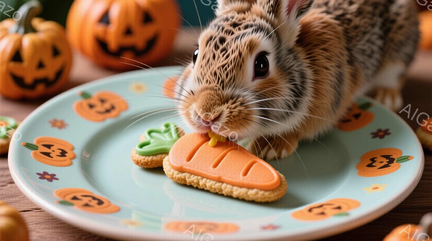 オレンジ色の可愛らしいウサギが、カラフルなクッキーを食べるために近づいている様子が写っています。クッキーはニンジン型で、緑色の葉っぱのデコレーションが施され、ハロウィーン風のパンプキン柄の皿に載せられています。背景にはぼんやりとオレンジ色のパンプキンがいくつか見え、全体的に暖かく、お祝いムードにあふれています。