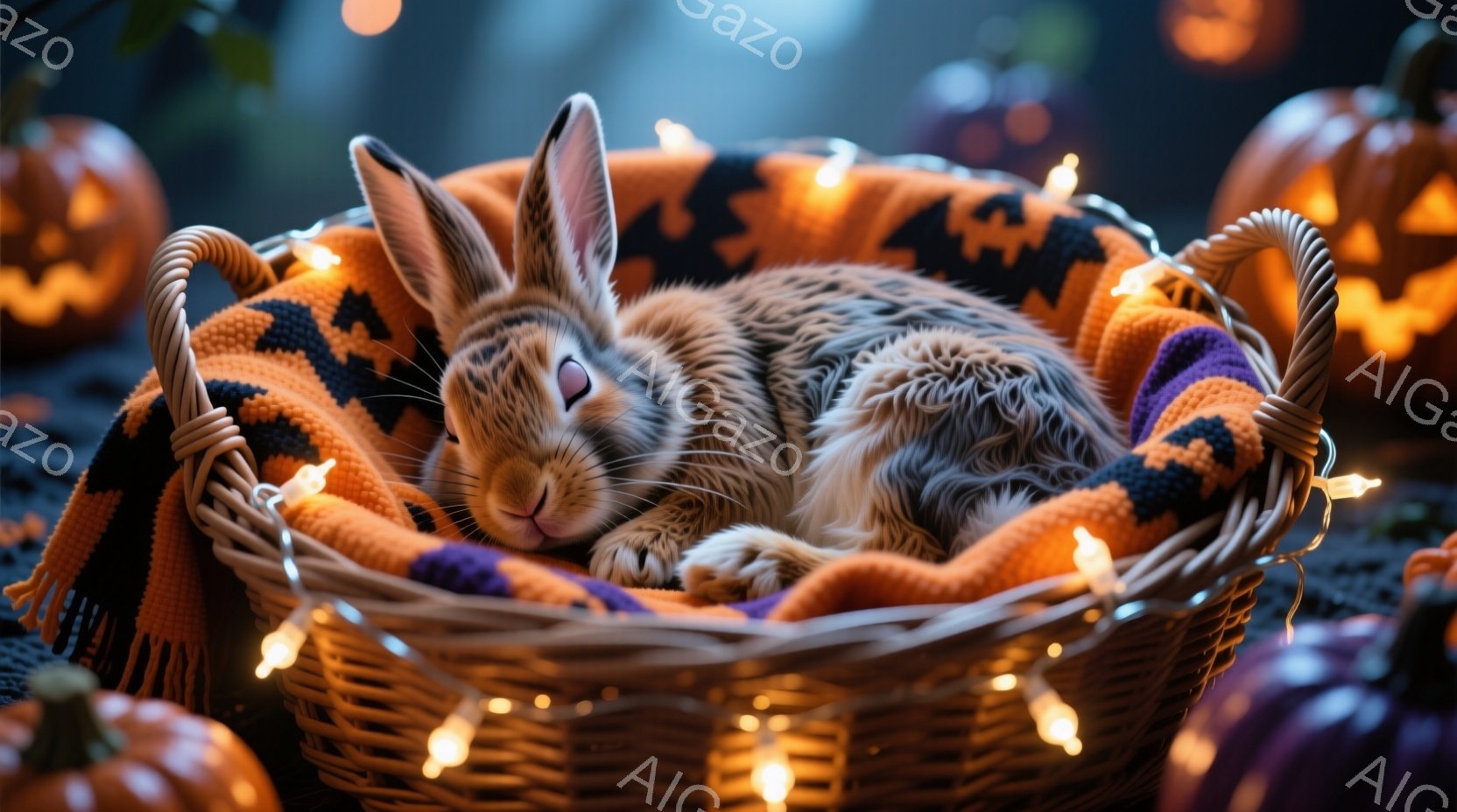 籠の中にふわふわの茶色のウサギが丸まって眠っています。周囲にはハロウィーンの装飾であるカボチャのランタンやオレンジと紫のストライプの布、そして暖かい光を放つ電飾が配置され、秋の暖かい雰囲気を醸し出しています。ウサギはリラックスした表情で、穏やかで平和な光景です。