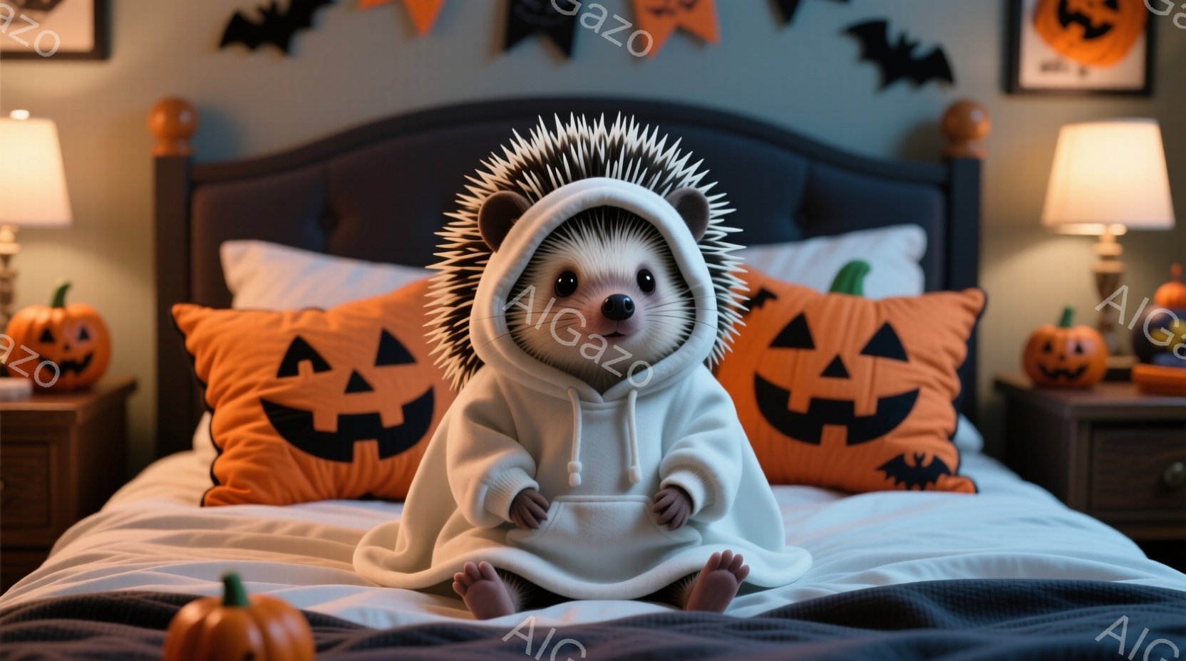 ハリネズミが白いパーカーを着てベッドに座っており、可愛らしい表情をしています。背景にはハロウィーンの装飾が施された部屋が広がり、オレンジ色のカボチャのクッションやランタンが暖かく秋の雰囲気を演出しています。全体的に、ほのぼのとした可愛らしいハロウィーンの雰囲気が漂う、心温まる画像です。
