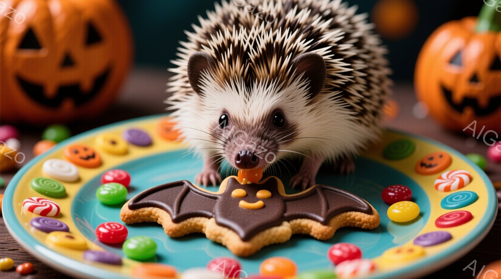 ハリネズミが、ハロウィーンをテーマにしたお皿の上でクッキーを食べている様子が写っています。お皿にはカラフルなキャンディーが散りばめられ、背景にはジャック・オー・ランタンがぼんやりと見えます。全体的に可愛らしく、お祭り気分を盛り上げる温かい雰囲気です。