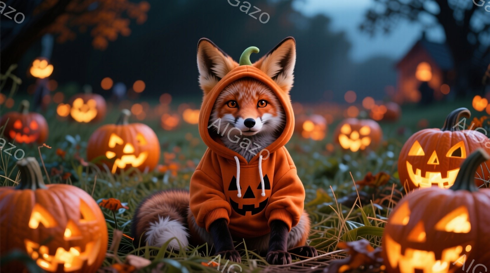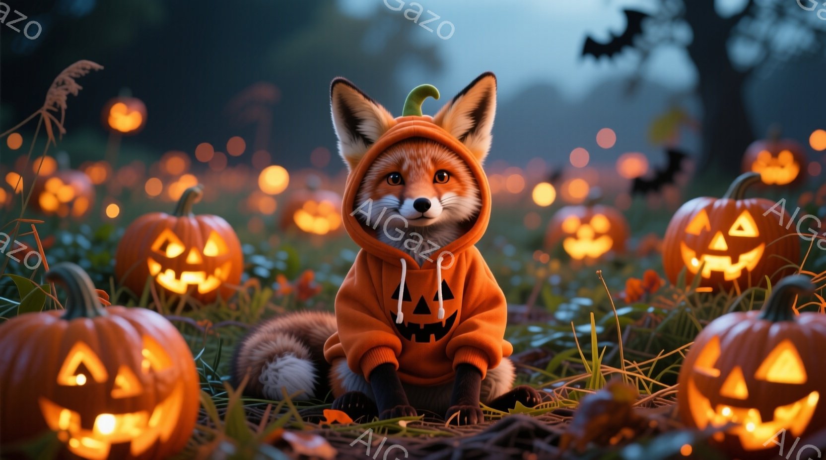 鮮やかなオレンジ色のカボチャのパーカーを着たキツネが、緑の草の上に座っています。周囲には、ジャック・オー・ランタンとして彫刻されたカボチャが並び、ハロウィーンの雰囲気を作り出しています。背景は暗く、ぼんやりとした木々と草が生い茂っており、暖かく幻想的な光景です。